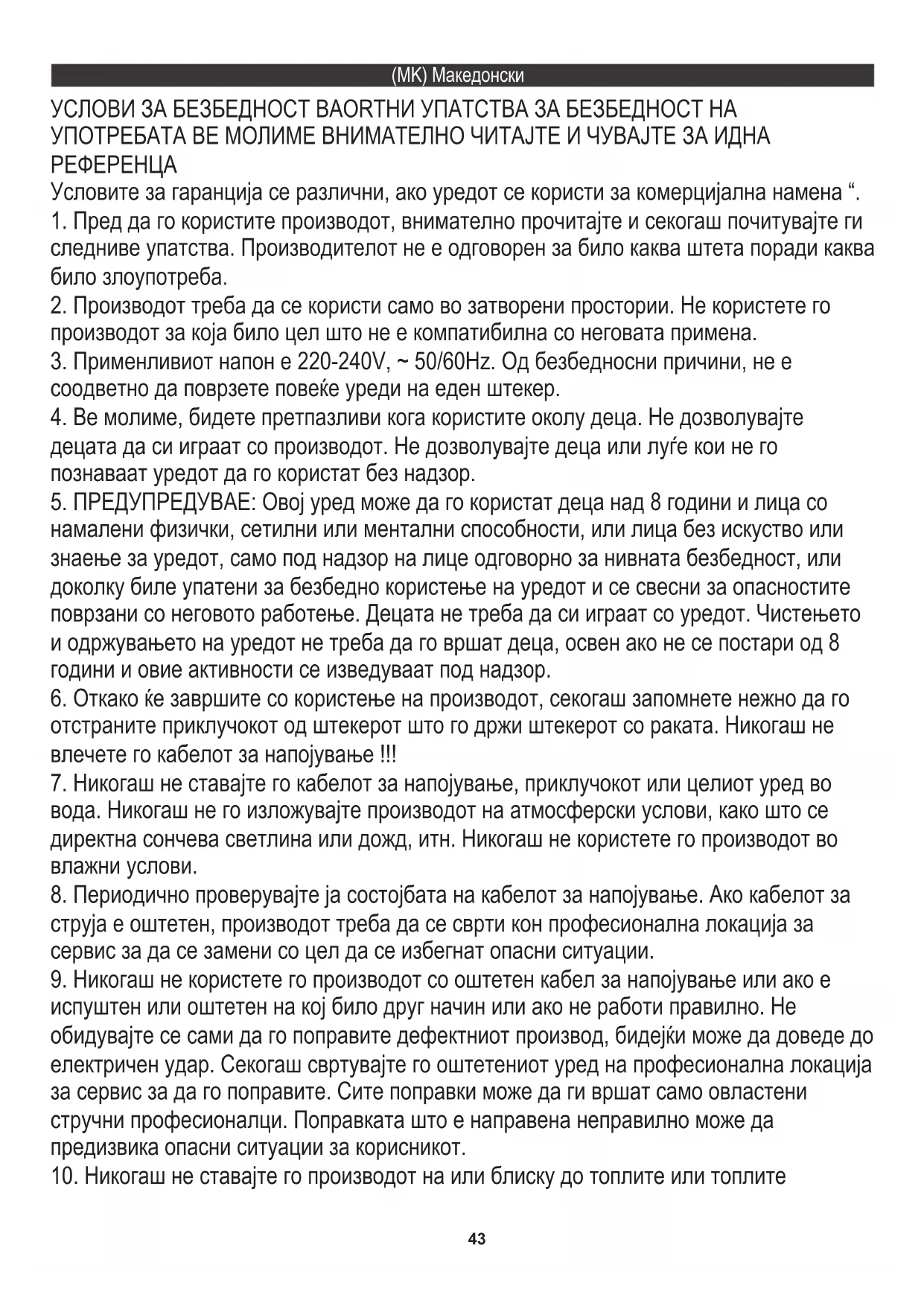 струја е оштетен, производот треба да се сврти кон професионална локација за сервис за да се замени со цел да се избегнат опасни ситуации. (MK) Mакедонски44