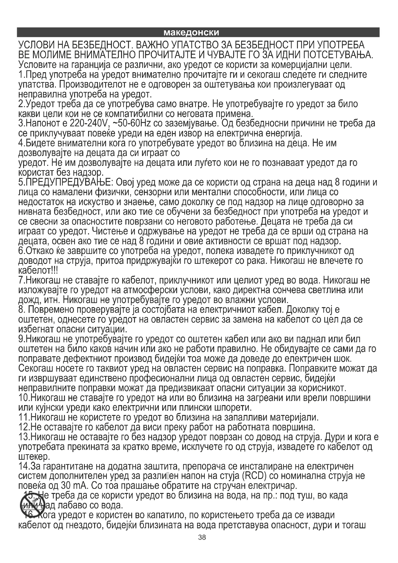 - Ne pas tremper le cordon, la fiche ou l'appareil entier dans l'eau ou dans tout autre liquide. Ne pas exposer l'appareil à des conditions atmosphériques (pluie, soleil etc.). Ne pas l'utiliser non plus dans des conditions d'humidity élevé (salle de bain, mobile-homes humides).