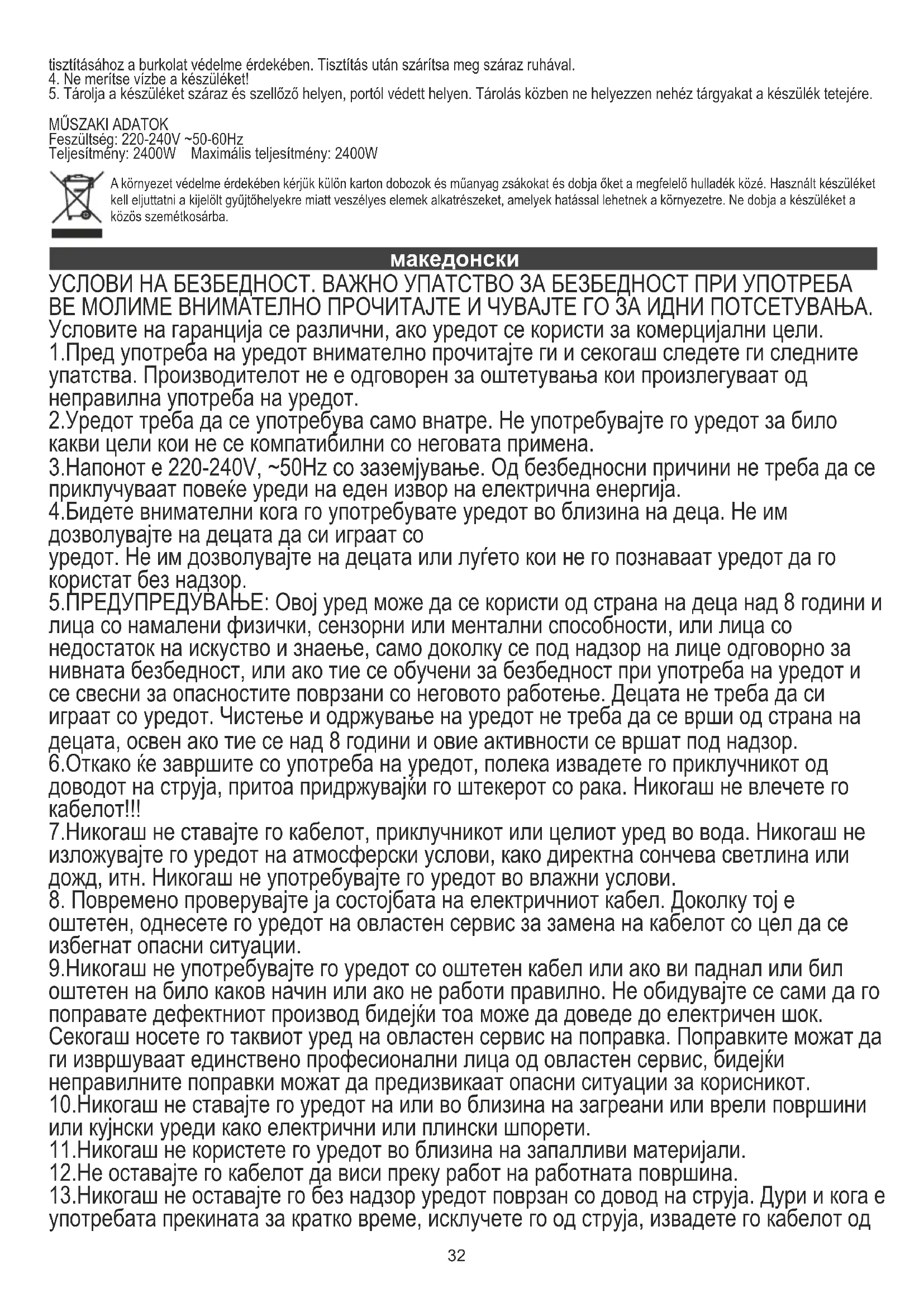 5. Чувајте го уредот на суво и проветрено место заштитено од прашина. Не ставајте тешки предмети на горниот дел од уредот за време на складирањето. ТЕХНИЧКИ ПОДАТОЦИ Напон: 220-240V ~50-60Hz Моќност: 2400 W Максимална моќност: 2400 W Се грижиме за природната средина. Картонските паковки молиме да се наменат за рециклирање. Полиетиленовите кеси (PE) да се фрлат во контењер за пластика. Искористениот уред треба да се предаде во соодветниот складирачки пункт, бидејќи небезбедните состојки кои се наоѓаат во уредот можат да бидат загрозување за средината. Електричниот уред треба да се предаде на начин кој ќе оневозможи негова повторна употреба и искористување. Доколку во уредот има батерии, треба да се извадат и посебно да се предадат во складирачкиот пункт.