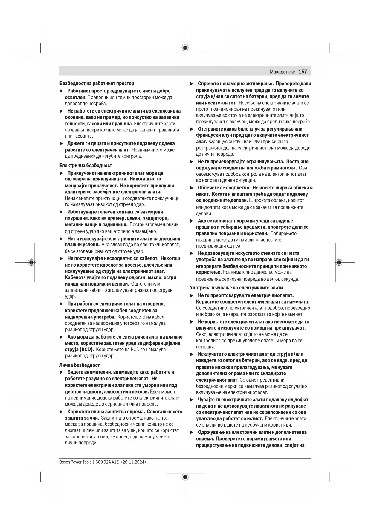 Прочитајте ги сите безбедносни предупредувања, илустрации и спецификации приложени со овој електричен алат. Непридржувањето до сите упатства приложени подолу може да доведе до струен удар, пожар и/или тешки повреди. Зачувајте ги безбедносните предупредувања и упатства за користење и за во иднина. Поимот „електричен алат“ во безбедносните предупредувања се однесува на електрични апарати што користат струја (кабелски) или апарати што користат батерии (акумулаторски). 1 609 92A A1Z | (26.11.2024) Bosch Power ToolsМакедонски | 157 Безбедност на работниот простор u Работниот простор одржувајте го чист и добро осветлен. Преполни или темни простории може да доведат до несреќа. u Не работете со електричните алати во експлозивна околина, како на пример, во присуство на запаливи течности, гасови или прашина. Електричните алати создаваат искри коишто може да ја запалат прашината или гасовите. u Држете ги децата и присутните подалеку додека работите со електричен алат. Невниманието може да предизвика да изгубите контрола. Електрична безбедност u Приклучокот на електричниот алат мора да одговара на приклучницата. Никогаш не го менувајте приклучокот. Не користите приклучни адаптери со заземјените електрични алати. Неизменетите приклучоци и соодветните приклучници го намалуваат ризикот од струен удар. u Избегнувајте телесен контакт со заземјени површини, како на пример, цевки, радијатори, метални ланци и ладилници. Постои зголемен ризик од струен удар ако вашето тело е заземјено. u Не ги изложувајте електричните алати на дожд или влажни услови. Ако влезе вода во електричниот алат, ќе се зголеми ризикот од струен удар. u Не постапувајте несоодветно со кабелот. Никогаш не го користете кабелот за носење, влечење или исклучување од струја на електричниот алат. Кабелот чувајте го подалеку од оган, масло, остри ивици или подвижни делови. Оштетени или заплеткани кабли го зголемуваат ризикот од струен