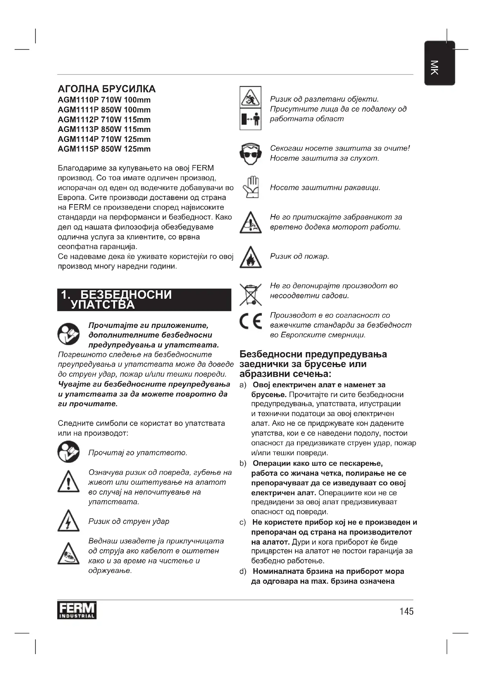 АГОЛНА БРУСИЛКА AGM1110P 710W 100mm AGM1111P 850W 100mm AGM1112P 710W 115mm AGM1113P 850W 115mm AGM1114P 710W 125mm AGM1115P 850W 125mm Благодариме за купувањето на овој FERM производ. Со тоа имате одличен производ, испорачан од еден од водечките добавувачи во Европа. Сите производи доставени од страна на FERM се произведени според највисоките стандарди на перформанси и безбедност. Како дел од нашата филозофија обезбедуваме одлична услуга за клиентите, со врвна сеопфатна гаранција. Се надеваме дека ќе уживате користејќи го овој производ многу наредни години.