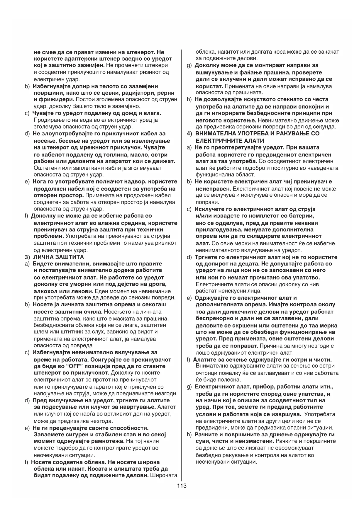 a) Бидете внимателни, внимавајте што правите и постапувајте внимателно додека работите со електричниот алат. Не работете со уредот доколку сте уморни или под дејство на дрога, алкохол или лекови. Еден момент на невнимание при употребата може да доведе до сеиозни повреди. b) Носете ја личната заштитна опрема и секогаш носете заштитни очила. Носењето на личната заштитна опрема, како што е маската за прашина, безбедносната облека која не се лизга, заштитен шлем или штитник за слух, зависно од видот и примената на електричниот алат, ја намалува опасноста од повреда. c) Избегнувајте невнимателно вклучување за време на работата. Осигурајте се прекинувачот да биде во “OFF” позиција пред да го ставите штекерот во приклучокот. Доколку го носите електричниот алат со прстот на прекинувачот или го приклучувате апаратот кој е приклучен со напојување на струја, може да предизвикате незгоди. d) Пред вклучување на уредот, тргнете ги алатите за подесување или клучот за навртување. Алатот или клучот кој се наоѓа во вртливиот дел на уредот, може да предизвика незгода. e) Не ги преценувајте своите способности. Завземете сигурен и стабилен став и во секој момент одржувајте рамнотежа. На тој начин можете подобро да го контролирате уредот во неочекувани ситуации. f) Носете соодветна облека. Не носете широка облека или накит. Косата и алиштата треба да бидат подалеку од подвижните делови. Широката114