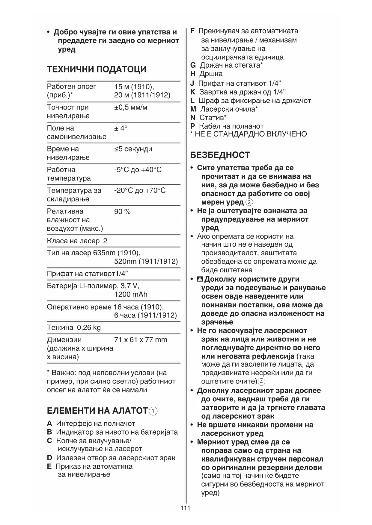 ! веднаш по вклучувањето, мерниот уред испраќа ласерски зрак од излезниот отвор D ! не го насочувајте зракот светлина на лица или животни и не погледнувајте директно во него, дури ни од голема оддалеченост - за да го исклучите мерниот уред, притиснете на ласерското копче C кога го користите БЕЗ автоматско нивелирање или на лизгачкиот прекинувач F во