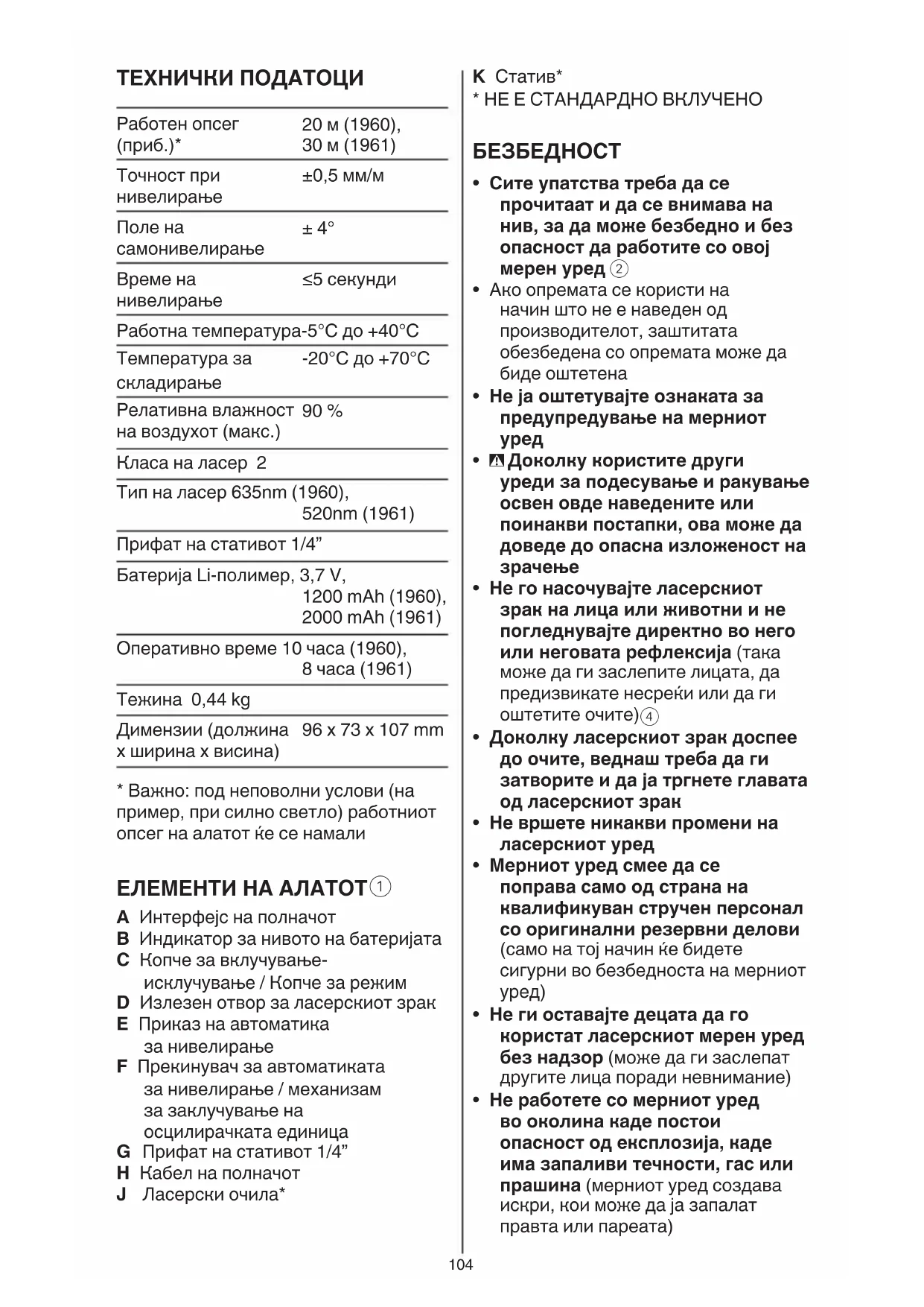 A Интерфејс на полначот B Индикатор за нивото на батеријата C Копче за вклучување- исклучување / Копче за режим D Излезен отвор за ласерскиот зрак E Приказ на автоматика за нивелирање F Прекинувач за автоматиката за нивелирање / механизам за заклучување на осцилирачката единица G Прифат на стативот 1/4” H Кабел на полначот J Ласерски очила*105 батеријата B го покажува преостанатиот капацитет на батеријата со различни бои - ЗЕЛЕНО покажува повеќе од 40 % од капацитетот - ЖОЛТО покажува помалку од 40 % од капацитетот - ЦРВЕНО покажува дека се преостанати само уште 30 минути пред да се исклучи автоматски