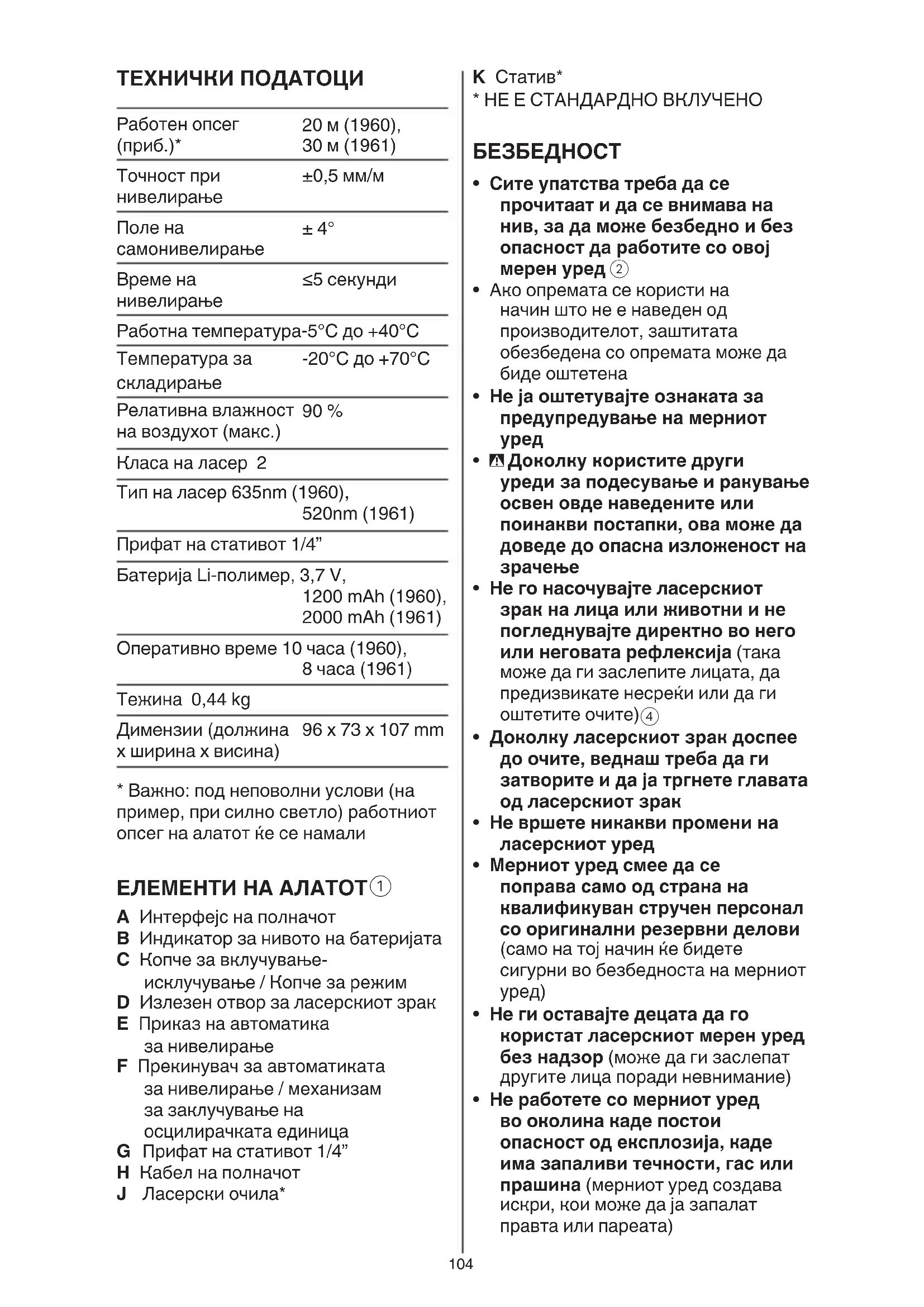 A Интерфејс на полначот B Индикатор за нивото на батеријата C Копче за вклучување- исклучување / Копче за режим D Излезен отвор за ласерскиот зрак E Приказ на автоматика за нивелирање F Прекинувач за автоматиката за нивелирање / механизам за заклучување на осцилирачката единица G Прифат на стативот 1/4” H Кабел на полначот J Ласерски очила*105 батеријата B го покажува преостанатиот капацитет на батеријата со различни бои - ЗЕЛЕНО покажува повеќе од 40 % од капацитетот - ЖОЛТО покажува помалку од 40 % од капацитетот - ЦРВЕНО покажува дека се преостанати само уште 30 минути пред да се исклучи автоматски