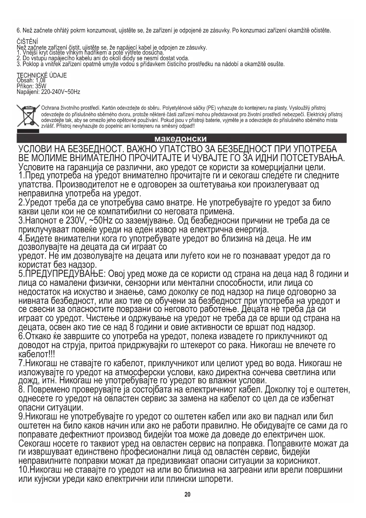 5. Aby bylo možné jídlo ohřát, nejdříve připojte napájecí kabel ke vstupu (8). Stiskněte bezpečnostní těsnění (4), až se zvedne jeho obruba. Dioda (2) indikuje, že zařízení je zapnuté.УСЛОВИ НА БЕЗБЕДНОСТ. ВАЖНО УПАТСТВО ЗА БЕЗБЕДНОСТ ПРИ УПОТРЕБА ВЕ МОЛИМЕ ВНИМАТЕЛНО ПРОЧИТАЈТЕ И ЧУВАЈТЕ ГО ЗА ИДНИ ПОТСЕТУВАЊА. Условите на гаранција се различни, ако уредот се користи за комерцијални цели. 1.Пред употреба на уредот внимателно прочитајте ги и секогаш следете ги следните упатства. Производителот не е одговорен за оштетувања кои произлегуваат од неправилна употреба на уредот. 2.Уредот треба да се употребува само внатре. Не употребувајте го уредот за било какви цели кои не се компатибилни со неговата примена. 3.Напонот е 230V, ~50Hz со заземјување. Од безбедносни причини не треба да се приклучуваат повеќе уреди на еден извор на електрична енергија. 4.Бидете внимателни кога го употребувате уредот во близина на деца. Не им дозволувајте на децата да си играат со уредот. Не им дозволувајте на децата или луѓето кои не го познаваат уредот да го користат без надзор. 5.ПРЕДУПРЕДУВАЊЕ: Овој уред може да се користи од страна на деца над 8 години и лица со намалени физички, сензорни или ментални способности, или лица со недостаток на искуство и знаење, само доколку се под надзор на лице одговорно за нивната безбедност, или ако тие се обучени за безбедност при употреба на уредот и се свесни за опасностите поврзани со неговото работење. Децата не треба да си играат со уредот. Чистење и одржување на уредот не треба да се врши од страна на децата, освен ако тие се над 8 години и овие активности се вршат под надзор. 6.Откако ќе завршите со употреба на уредот, полека извадете го приклучникот од доводот на струја, притоа придржувајќи го штекерот со рака. Никогаш не влечете го