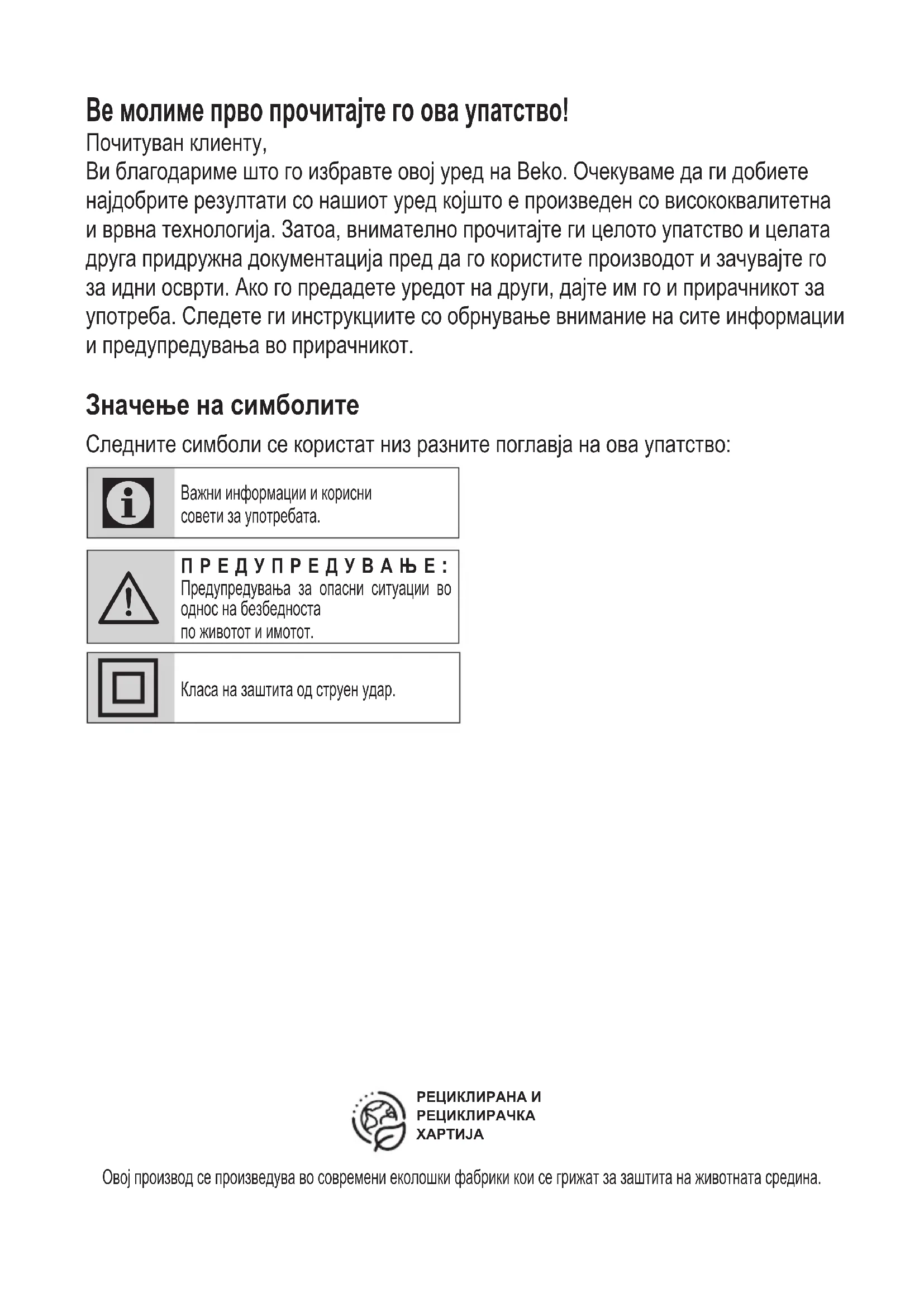 Юридический адрес: 601021 Россия, Владимирская обл., Киржачский р-н, дер. Федоровское, ул. Сельская, д. 49 Дата производства включена в серийный но мер продукта, указанный на этикетке, располо женной на продукте, а именно: первые две цифры серийного номера обозна чают год производства, а последние две – ме сяц. Например, «10-100001-05» обозначает, что продукт произведен в мае 2010 года.Ве молиме прво прочитајте го ова упатство! Почитуван клиенту, Ви благодариме што го избравте овој уред на Beko. Очекуваме да ги добиете најдобрите резултати со нашиот уред којшто е произведен со висококвалитетна и врвна технологија. Затоа, внимателно прочитајте ги целото упатство и целата друга придружна документација пред да го користите производот и зачувајте го за идни осврти. Ако го предадете уредот на други, дајте им го и прирачникот за употреба. Следете ги инструкциите со обрнување внимание на сите информации и предупредувања во прирачникот. Значење на симболите Следните симболи се користат низ разните поглавја на ова упатство: