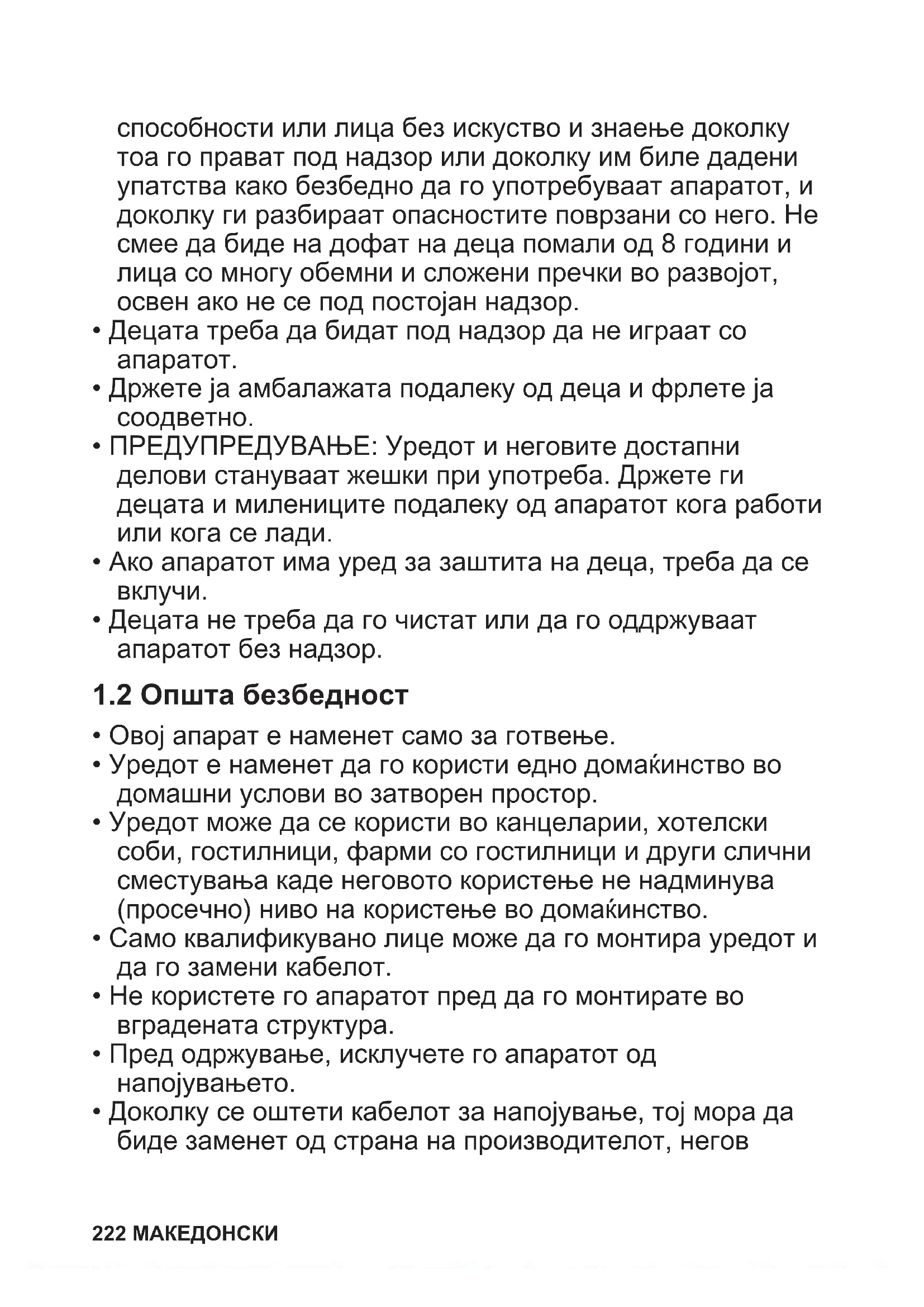 - Овој апарат може да го користат деца над 8 години и лица со намалени физички, сетилни или ментални МАКЕДОНСКИ 221способности или лица без искуство и знаење доколку тоа го прават под надзор или доколку им биле дадени упатства како безбедно да го употребуваат апаратот, и доколку ги разбираат опасностите поврзани со него. Не смее да биде на дофат на деца помали од 8 години и лица со многу обемни и сложени пречки во развојот, освен ако не се под постојан надзор.