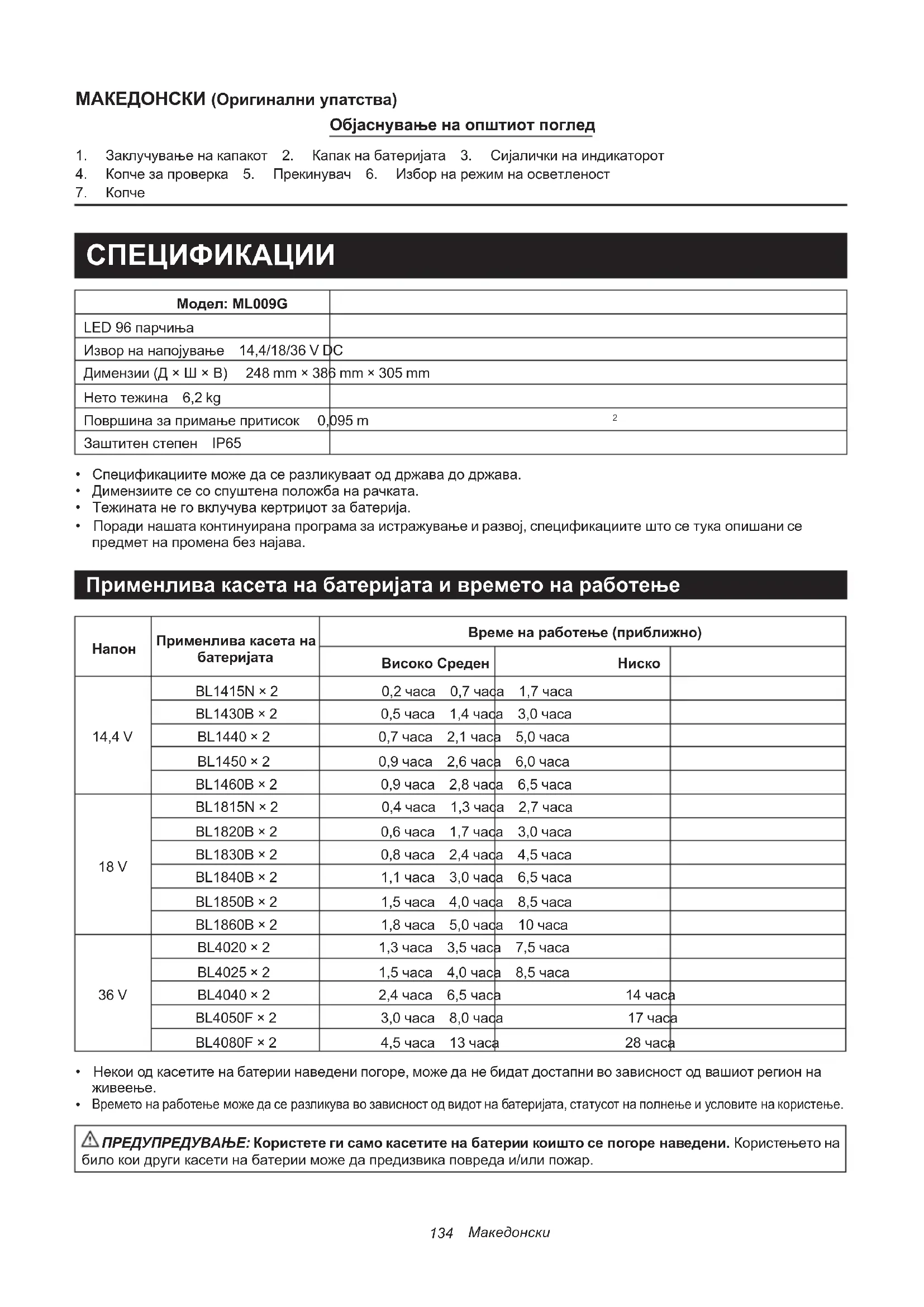 Времетонаработењеможедасеразликувавозависностодвидотнабатеријата,статусотнаполнењеиусловитенакористење. ПРЕДУПРЕДУВАЊЕ: Користете ги само касетите на батерии коишто се погоре наведени.Користењетона билокоидругикасетинабатерииможедапредизвикаповредаи/илипожар. Македонски135