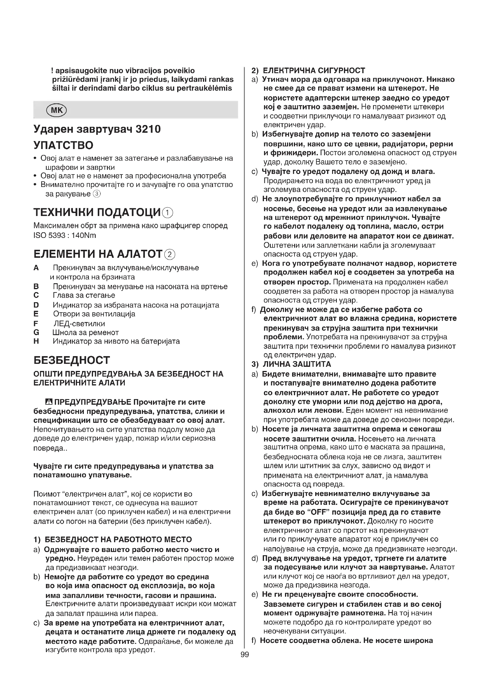 a) Бидете внимателни, внимавајте што правите и постапувајте внимателно додека работите со електричниот алат. Не работете со уредот доколку сте уморни или под дејство на дрога, алкохол или лекови. Еден момент на невнимание при употребата може да доведе до сеиозни повреди. b) Носете ја личната заштитна опрема и секогаш носете заштитни очила. Носењето на личната заштитна опрема, како што е маската за прашина, безбедносната облека која не се лизга, заштитен шлем или штитник за слух, зависно од видот и примената на електричниот алат, ја намалува опасноста од повреда. c) Избегнувајте невнимателно вклучување за време на работата. Осигурајте се прекинувачот да биде во “OFF” позиција пред да го ставите штекерот во приклучокот. Доколку го носите електричниот алат со прстот на прекинувачот или го приклучувате апаратот кој е приклучен со напојување на струја, може да предизвикате незгоди. d) Пред вклучување на уредот, тргнете ги алатите за подесување или клучот за навртување. Алатот или клучот кој се наоѓа во вртливиот дел на уредот, може да предизвика незгода. e) Не ги преценувајте своите способности. Завземете сигурен и стабилен став и во секој момент одржувајте рамнотежа. На тој начин можете подобро да го контролирате уредот во неочекувани ситуации. f) Носете соодветна облека. Не носете широка ! apsisaugokite nuo vibracijos poveikio prižiūrėdami įrankį ir jo priedus, laikydami rankas šiltai ir derindami darbo ciklus su pertraukėlėmis