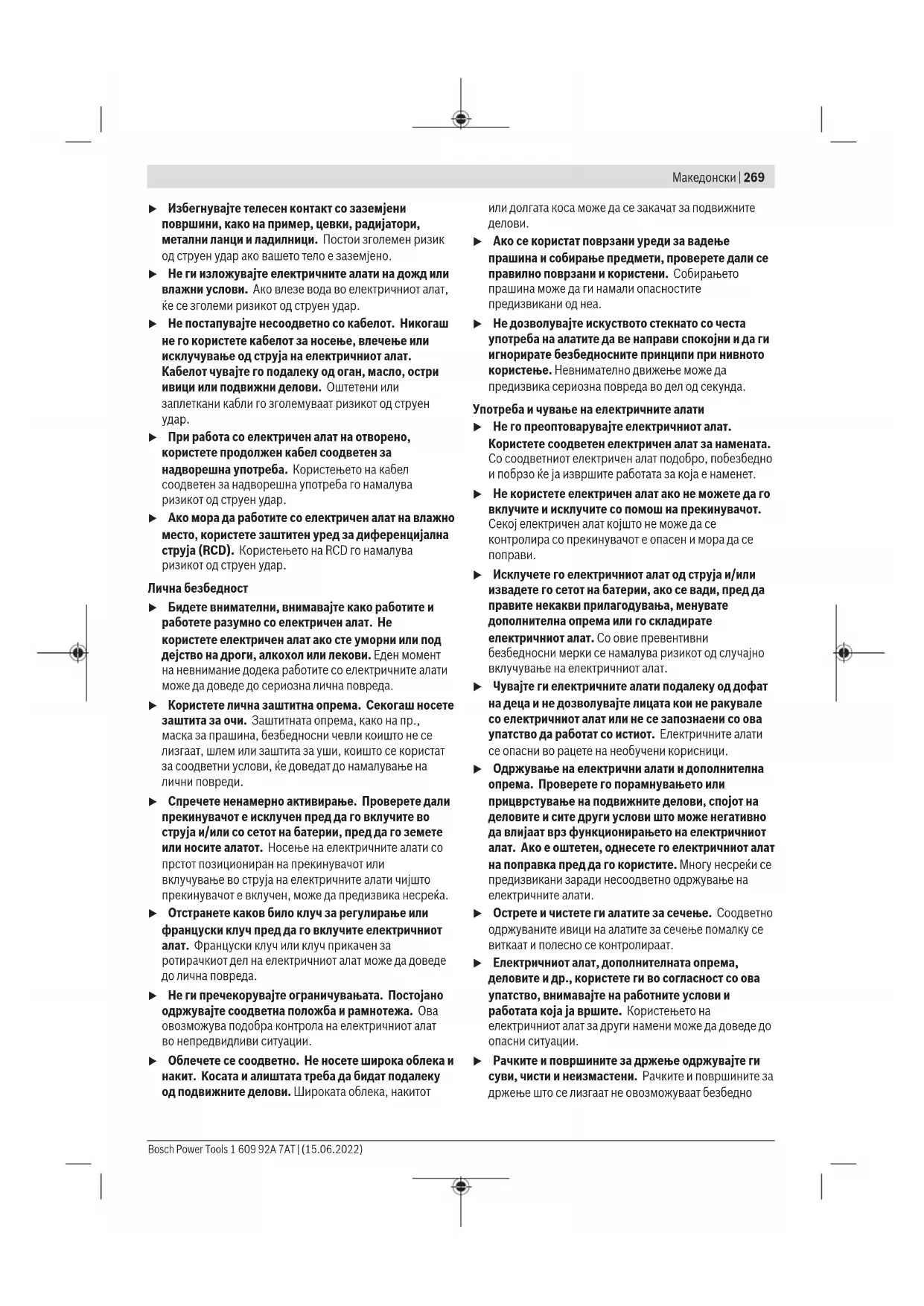 Прочитајте ги сите безбедносни предупредувања, илустрации и спецификации приложени со овој електричен алат. Непридржувањето до сите упатства приложени подолу може да доведе до струен удар, пожар и/или тешки повреди. Зачувајте ги безбедносните предупредувања и упатства за користење и за во иднина. Поимот „електричен алат“ во безбедносните предупредувања се однесува на електрични апарати што користат струја (кабелски) или апарати што користат батерии (акумулаторски). Безбедност на работниот простор u Работниот простор одржувајте го чист и добро осветлен. Преполни или темни простории може да доведат до несреќа. u Не работете со електричните алати во експлозивна околина, како на пример, во присуство на запаливи течности, гасови или прашина. Електричните алати создаваат искри коишто може да ја запалат прашината или гасовите. u Држете ги децата и присутните подалеку додека работите со електричен алат. Невниманието може да предизвика да изгубите контрола. Електрична безбедност u Приклучокот на електричниот алат мора да одговара на приклучницата. Никогаш не го менувајте приклучокот. Не користите приклучни адаптери со заземјените електрични алати. Неизменетите приклучоци и соодветните приклучници го намалуваат ризикот од струен удар. 1 609 92A 7AT | (15.06.2022) Bosch Power ToolsМакедонски | 269 u Избегнувајте телесен контакт со заземјени површини, како на пример, цевки, радијатори, метални ланци и ладилници. Постои зголемен ризик од струен удар ако вашето тело е заземјено. u Не ги изложувајте електричните алати на дожд или влажни услови. Ако влезе вода во електричниот алат, ќе се зголеми ризикот од струен удар. u Не постапувајте несоодветно со кабелот. Никогаш не го користете кабелот за носење, влечење или исклучување од струја на електричниот алат. Кабелот чувајте го подалеку од оган, масло, остри ивици или подвижни делови. Оштетени или заплеткани кабли го зголемуваат ризикот од струен