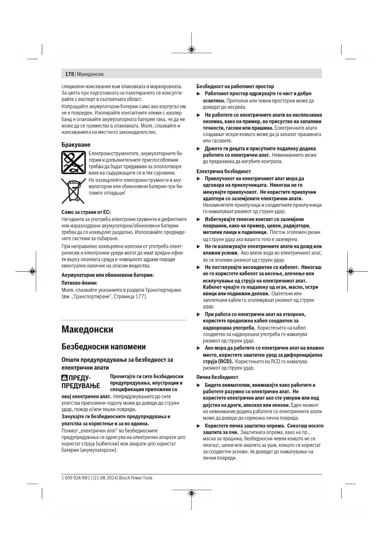 u При работа со електричен алат на отворено, користете продолжен кабел соодветен за надворешна употреба. Користењето на кабел соодветен за надворешна употреба го намалува ризикот од струен удар. u Ако мора да работите со електричен алат на влажно место, користете заштитен уред за диференцијална струја (RCD). Користењето на RCD го намалува ризикот од струен удар. Лична безбедност u Бидете внимателни, внимавајте како работите и работете разумно со електричен алат. Не користете електричен алат ако сте уморни или под дејство на дроги, алкохол или лекови. Еден момент на невнимание додека работите со електричните алати може да доведе до сериозна лична повреда. u Користете лична заштитна опрема. Секогаш носете заштита за очи. Заштитната опрема, како на пр., маска за прашина, безбедносни чевли коишто не се лизгаат, шлем или заштита за уши, коишто се користат за соодветни услови, ќе доведат до намалување на лични повреди. 1 609 92A 9W1 | (21.08.2024) Bosch Power ToolsМакедонски | 179 u Спречете ненамерно активирање. Проверете дали прекинувачот е исклучен пред да го вклучите во струја и/или со сетот на батерии, пред да го земете или носите алатот. Носење на електричните алати со прстот позициониран на прекинувачот или вклучување во струја на електричните алати чијшто прекинувачот е вклучен, може да предизвика несреќа. u Отстранете каков било клуч за регулирање или француски клуч пред да го вклучите електричниот алат. Француски клуч или клуч прикачен за ротирачкиот дел на електричниот алат може да доведе до лична повреда. u Не ги пречекорувајте ограничувањата. Постојано одржувајте соодветна положба и рамнотежа. Ова овозможува подобра контрола на електричниот алат во непредвидливи ситуации. u Облечете се соодветно. Не носете широка облека и накит. Косата и алиштата треба да бидат подалеку од подвижните делови. Широката облека, накитот или долгата коса може да се закачат за подвижните