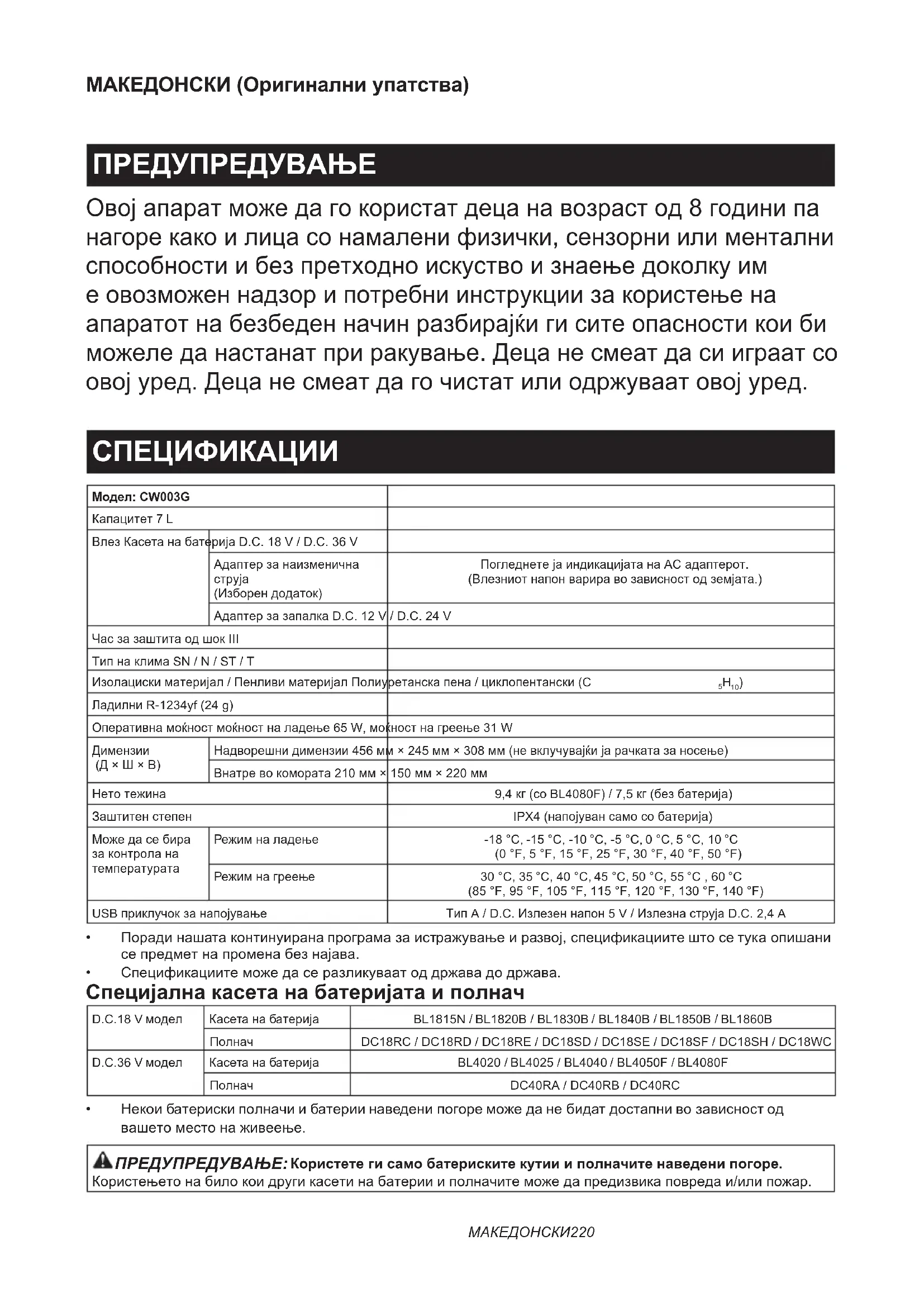 - Originalna baterija i punjač Makita NAPOMENA: Neke stavke s popisa mogu biti uklju- čene u paket alata kao standardni dodaci. Mogu se razlikovati od zemlje do zemlje.МАКЕДОНСКИ220 МАКЕДОНСКИ (Оригинални упатства) ПРЕДУПРЕДУВАЊЕ Овој апарат може да го користат деца на возраст од 8 години па нагоре како и лица со намалени физички, сензорни или ментални способности и без претходно искуство и знаење доколку им е овозможен надзор и потребни инструкции за користење на апаратот на безбеден начин разбирајќи ги сите опасности кои би можеле да настанат при ракување. Деца не смеат да си играат со овој уред. Деца не смеат да го чистат или одржуваат овој уред. СПЕЦИФИКАЦИИ Модел: CW003GКапацитет 7 LВлез Касета на батерија D.C. 18 V / D.C. 36 VАдаптер за наизменична струја (Изборен додаток)Погледнете ја индикацијата на AC адаптерот. (Влезниот напон варира во зависност од земјата.)Адаптер за запалка D.C. 12 V / D.C. 24 VЧас за заштита од шок IIIТип на клима SN / N / ST / TИзолациски материјал / Пенливи материјал Полиуретанска пена / циклопентански (C