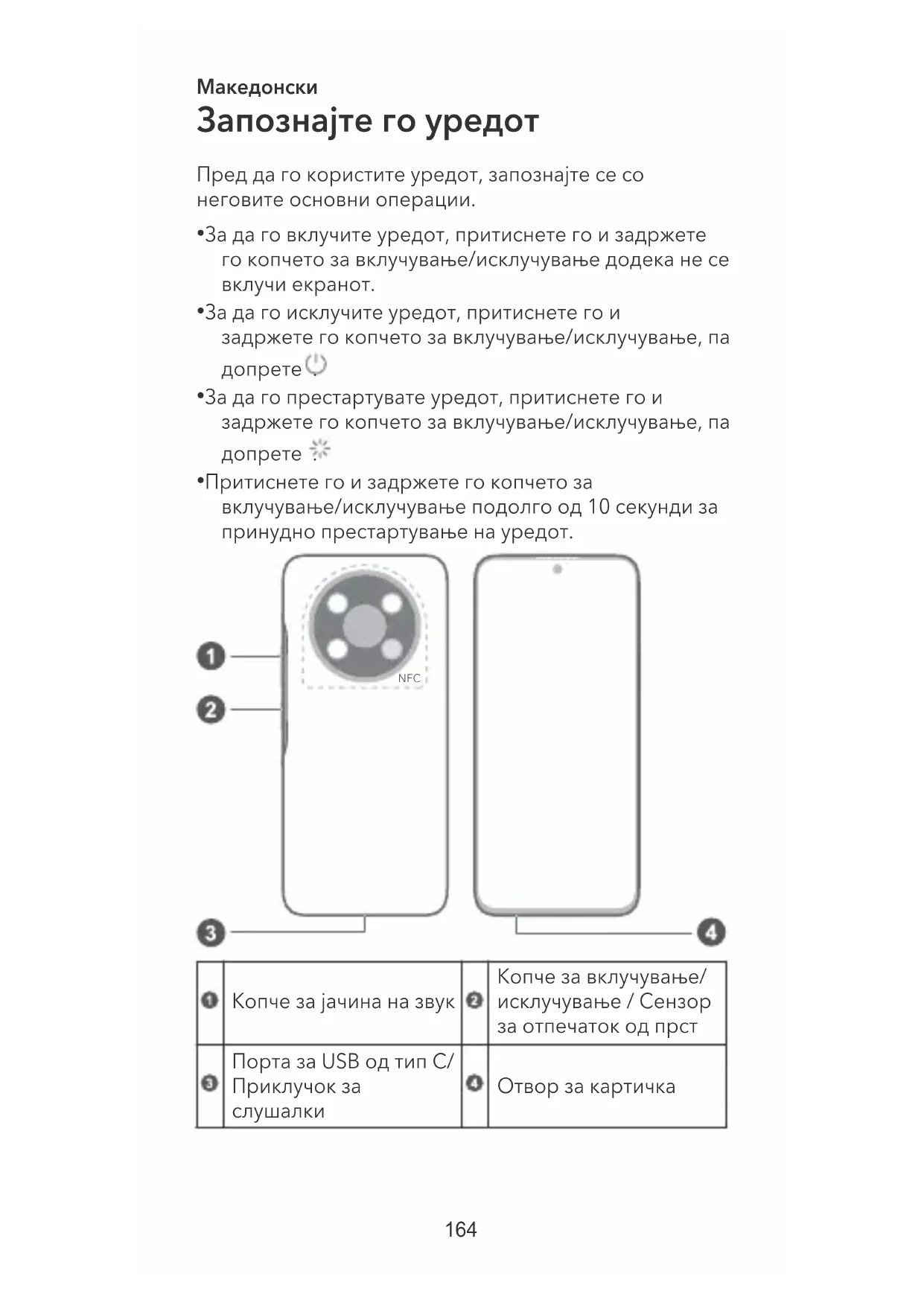 - Притиснете го и задржете го копчето за вклучување/исклучување подолго од 10 секунди за принудно престартување на уредот. NFC Копче за јачина на звук Kопче за вклучување/ исклучување / Сензор за отпечаток од прст Порта за USB од тип C/ Приклучок за