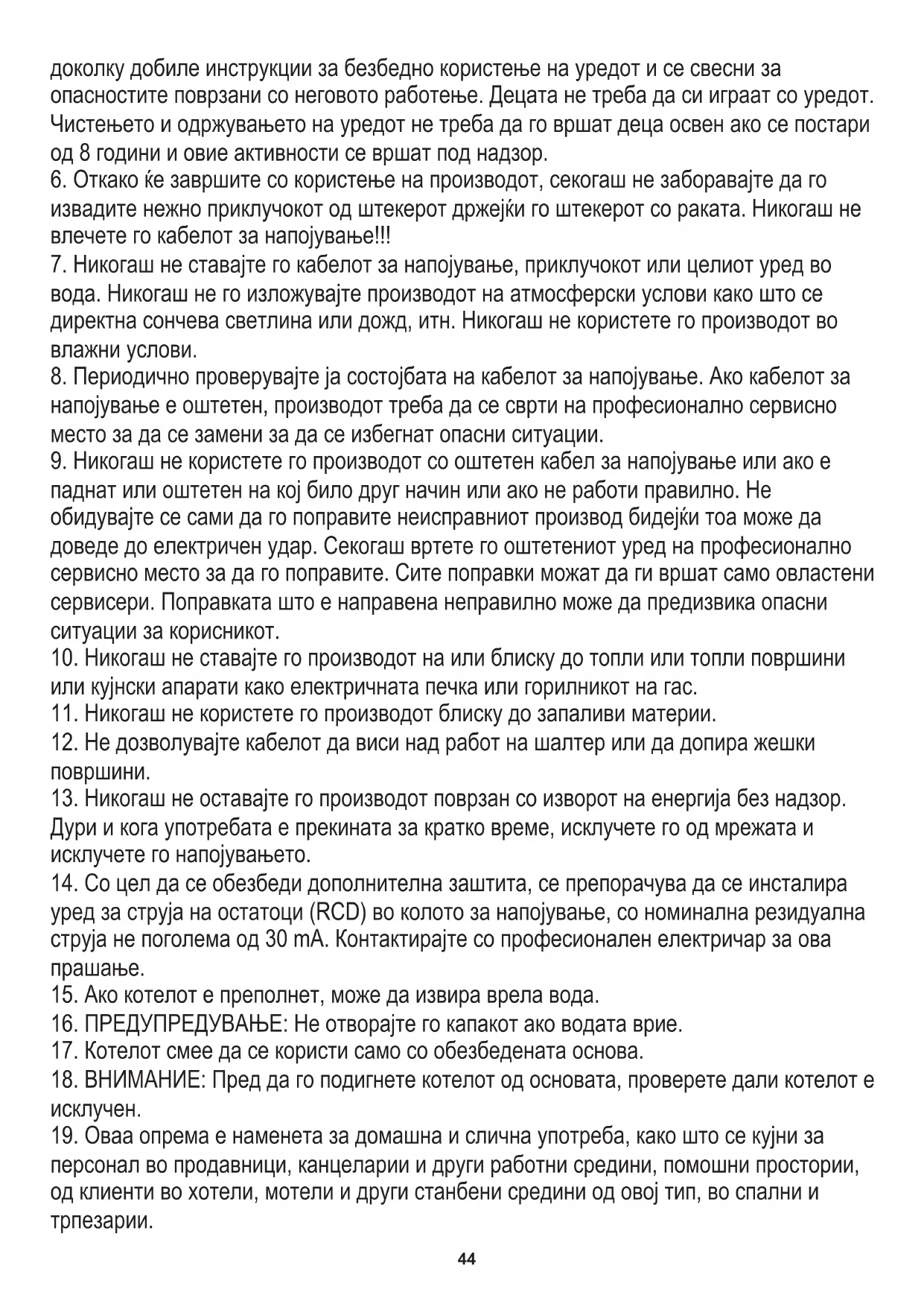 соодветно да се поврзат повеќе уреди на еден штекер. БЕЗБЕДНОСНИ УСЛОВИ ВАЖНИ ИНСТРУКЦИИ ЗА БЕЗБЕДНОСТ НА УПОТРЕБА ВЕ МОЛИМЕ ПРОЧИТАЈТЕ ВНИМАТЕЛНО И ЧУВАЈТЕ ЗА ИДНИ РЕФЕРЕНЦИ (MK) Mакедонски44 доколку добиле инструкции за безбедно користење на уредот и се свесни за опасностите поврзани со неговото работење. Децата не треба да си играат со уредот. Чистењето и одржувањето на уредот не треба да го вршат деца освен ако се постари од 8 години и овие активности се вршат под надзор.
