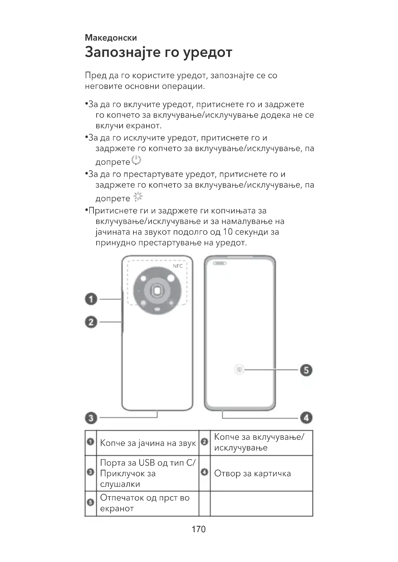 - Притиснете ги и задржете ги копчињата за вклучување/исклучување и за намалување на јачината на звукот подолго од 10 секунди за принудно престартување на уредот. NFC Копче за јачина на звук Копче за вклучување/ исклучување Порта за USB од тип C/ Приклучок за