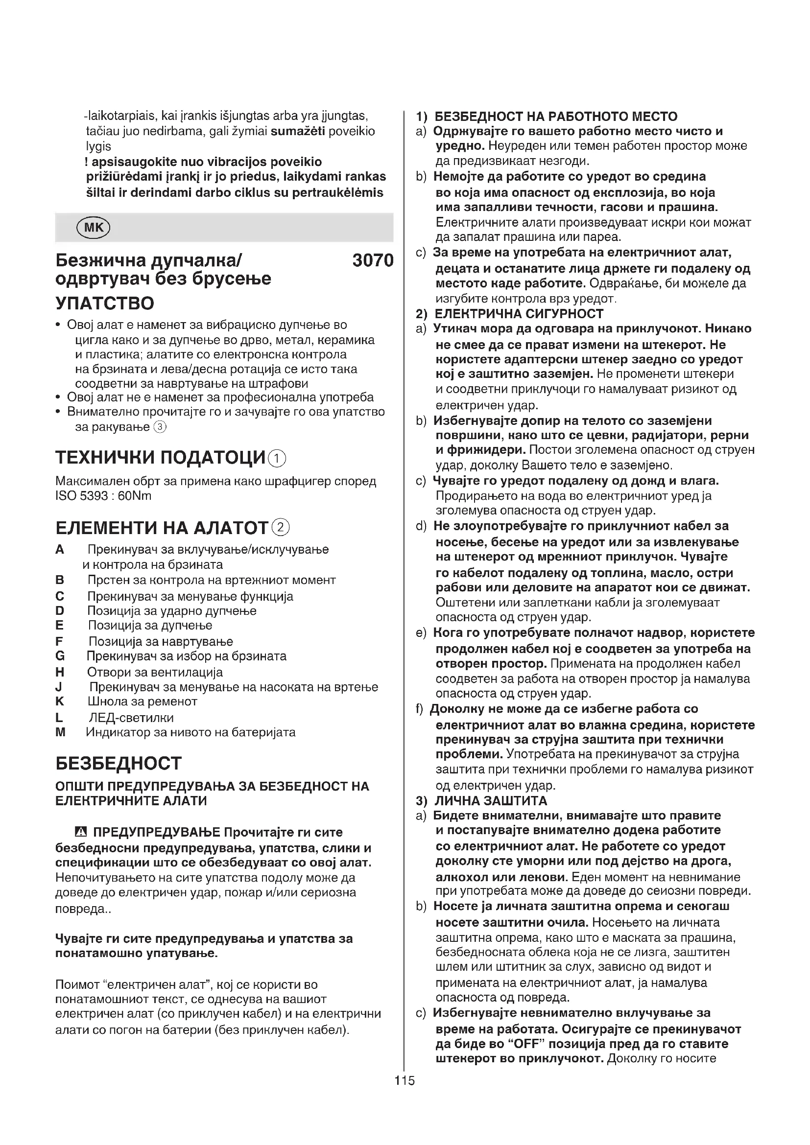 a) Бидете внимателни, внимавајте што правите и постапувајте внимателно додека работите со електричниот алат. Не работете со уредот доколку сте уморни или под дејство на дрога, алкохол или лекови. Еден момент на невнимание при употребата може да доведе до сеиозни повреди. b) Носете ја личната заштитна опрема и секогаш носете заштитни очила. Носењето на личната заштитна опрема, како што е маската за прашина, безбедносната облека која не се лизга, заштитен шлем или штитник за слух, зависно од видот и примената на електричниот алат, ја намалува опасноста од повреда. c) Избегнувајте невнимателно вклучување за време на работата. Осигурајте се прекинувачот да биде во “OFF” позиција пред да го ставите штекерот во приклучокот. Доколку го носите - laikotarpiais, kai įrankis išjungtas arba yra įjungtas, tačiau juo nedirbama, gali žymiai sumažėti poveikio lygis ! apsisaugokite nuo vibracijos poveikio prižiūrėdami įrankį ir jo priedus, laikydami rankas šiltai ir derindami darbo ciklus su pertraukėlėmis
