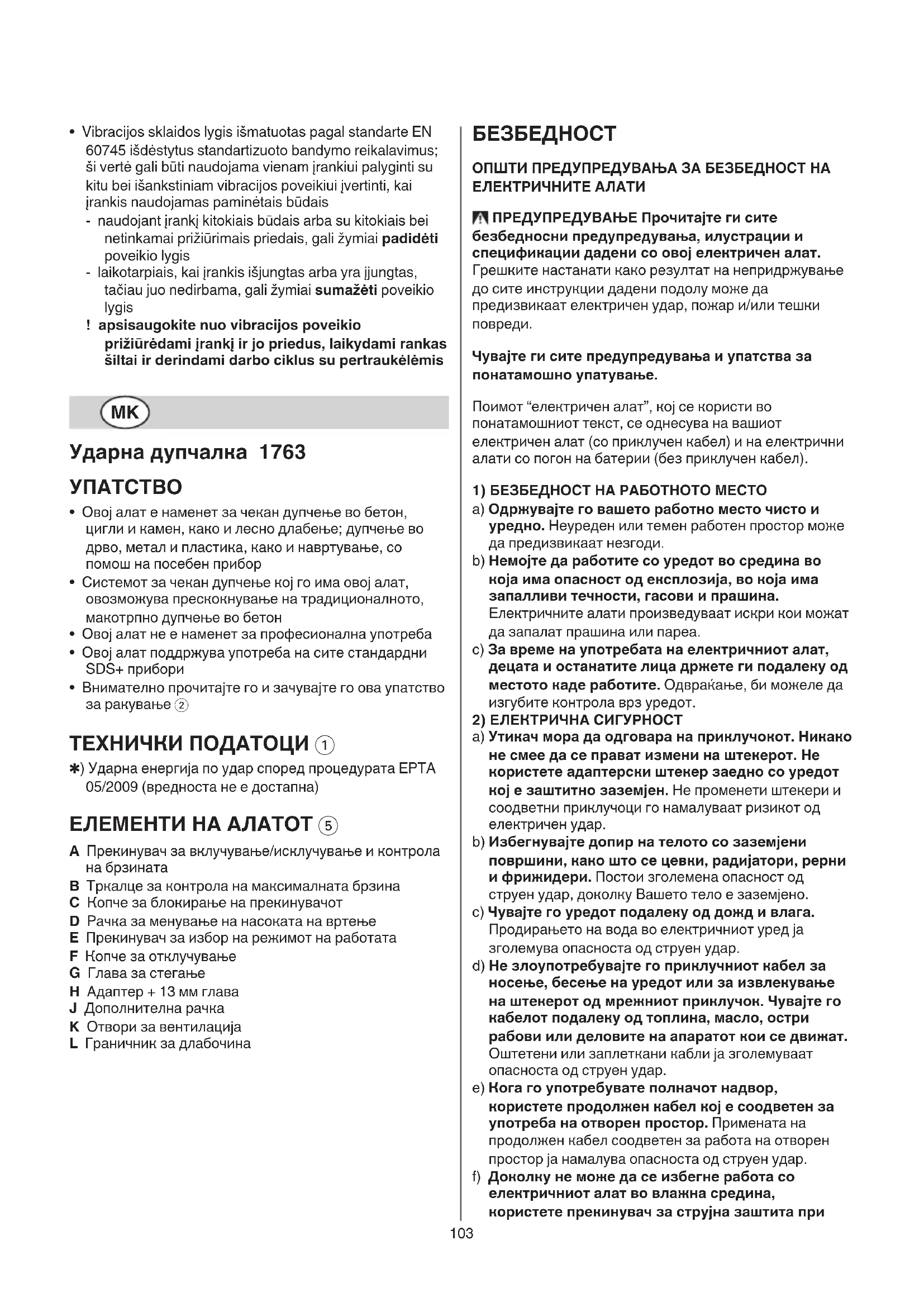 - Внимателно прочитајте го и зачувајте го ова упатство за ракување 2 ТЕХНИЧКИ ПОДАТОЦИ 1 ✱) Ударна енергија по удар според процедурата EPTA 05/2009 (вредноста не е достапна) ЕЛЕМЕНТИ НА АЛАТОТ 5 A Прекинувач за вклучување/исклучување и контрола на брзината B Тркалце за контрола на максималната брзина C Копче за блокирање на прекинувачот D Рачка за менување на насоката на вртење E Прекинувач за избор на режимот на работата F Копче за отклучување G Глава за стегање H Адаптер + 13 мм глава J Дополнителна рачка K Отвори за вентилација L Граничник за длабочина
