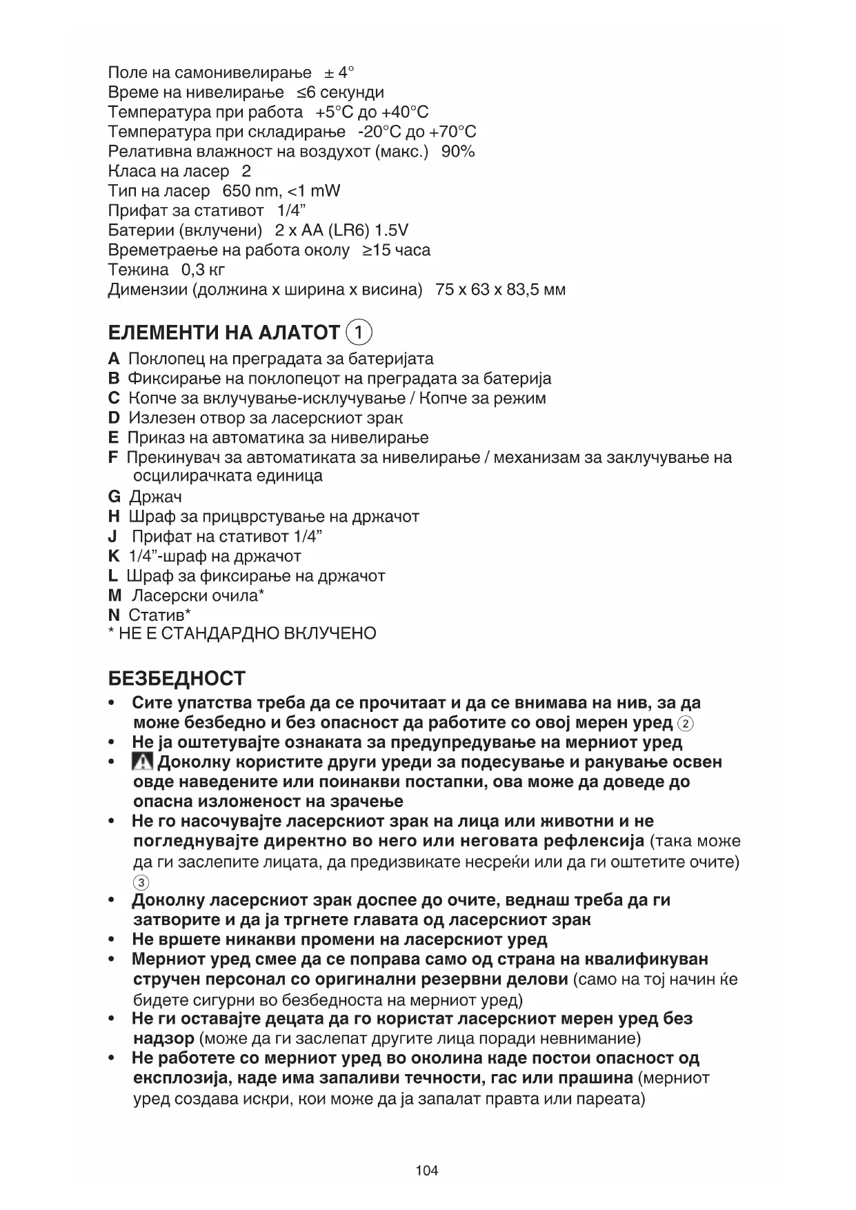 - Доброчувајтегиовиеупатстваипредадетегизаедносомерниотуред ТЕХНИЧКИПОДАТОЦИ Работно поле до околу. 10 м Точност при нивелирање ±0,5 мм/м104 Поле на самонивелирање ± 4° Време на нивелирање ≥6 секунди Температура при работа +5°C до +40°C Температура при складирање -20°C до +70°C Релативна влажност на воздухот (макс.) 90% Класа на ласер 2 Тип на ласер 650 nm, <1 mW Прифат за стативот 1/4” Батерии (вклучени) 2 x AA (LR6) 1.5V Времетраење на работа околу ≤15 часа Тежина 0,3 кг Димензии (должина x ширина x висина) 75 x 63 x 83,5 мм ЕЛЕМЕНТИНААЛАТОТ1 A Поклопец на преградата за батеријата B Фиксирање на поклопецот на преградата за батерија C Копче за вклучување-исклучување / Копче за режим D Излезен отвор за ласерскиот зрак E Приказ на автоматика за нивелирање F Прекинувач за автоматиката за нивелирање / механизам за заклучување на осцилирачката единица G Држач H Шраф за прицврстување на држачот J Прифат на стативот 1/4” K 1/4”-шраф на држачот L Шраф за фиксирање на држачот M Ласерски очила* N Статив*