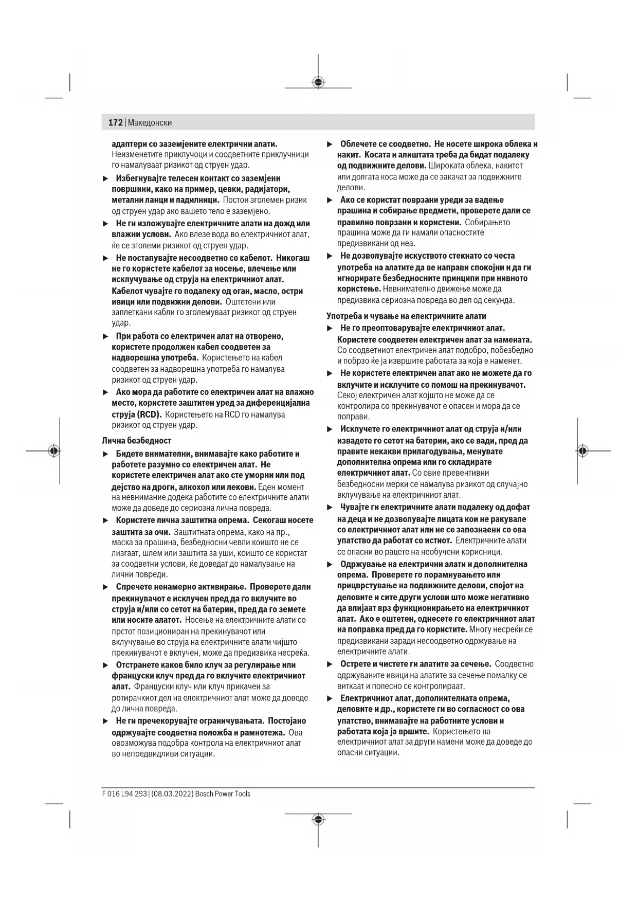Прочитајте ги сите безбедносни предупредувања, илустрации и спецификации приложени со овој електричен алат. Непридржувањето до сите упатства приложени подолу може да доведе до струен удар, пожар и/или тешки повреди. Зачувајте ги безбедносните предупредувања и упатства за користење и за во иднина. Поимот „електричен алат“ во безбедносните предупредувања се однесува на електрични апарати што користат струја (кабелски) или апарати што користат батерии (акумулаторски). Безбедност на работниот простор u Работниот простор одржувајте го чист и добро осветлен. Преполни или темни простории може да доведат до несреќа. u Не работете со електричните алати во експлозивна околина, како на пример, во присуство на запаливи течности, гасови или прашина. Електричните алати создаваат искри коишто може да ја запалат прашината или гасовите. u Држете ги децата и присутните подалеку додека работите со електричен алат. Невниманието може да предизвика да изгубите контрола. Електрична безбедност u Приклучокот на електричниот алат мора да одговара на приклучницата. Никогаш не го менувајте приклучокот. Не користите приклучни Bosch Power Tools F 016 L94 293 | (08.03.2022)172 | Македонски адаптери со заземјените електрични алати. Неизменетите приклучоци и соодветните приклучници го намалуваат ризикот од струен удар. u Избегнувајте телесен контакт со заземјени површини, како на пример, цевки, радијатори, метални ланци и ладилници. Постои зголемен ризик од струен удар ако вашето тело е заземјено. u Не ги изложувајте електричните алати на дожд или влажни услови. Ако влезе вода во електричниот алат, ќе се зголеми ризикот од струен удар. u Не постапувајте несоодветно со кабелот. Никогаш не го користете кабелот за носење, влечење или исклучување од струја на електричниот алат. Кабелот чувајте го подалеку од оган, масло, остри ивици или подвижни делови. Оштетени или заплеткани кабли го зголемуваат ризикот од струен