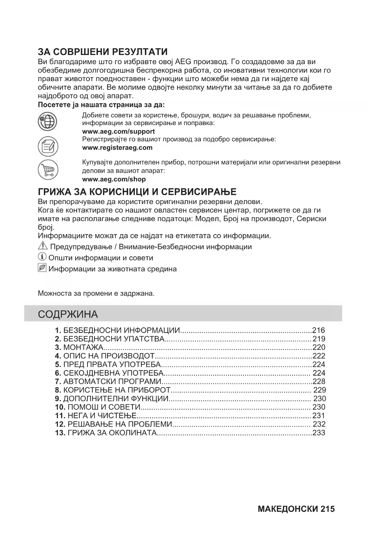 Потребните податоци за сервисниот центар се на плочката со спецификации. Плочката со спецификации се наоѓа на апаратот. Не отстранувајте ја плочката со спецификации од апаратот. Ви препорачуваме податоците да ги впишете тука: Модел (MOD.) ........................................ 232 МАКЕДОНСКИВи препорачуваме податоците да ги впишете тука: Број на производ (PNC) ........................................ Сериски број (S.N.) ........................................