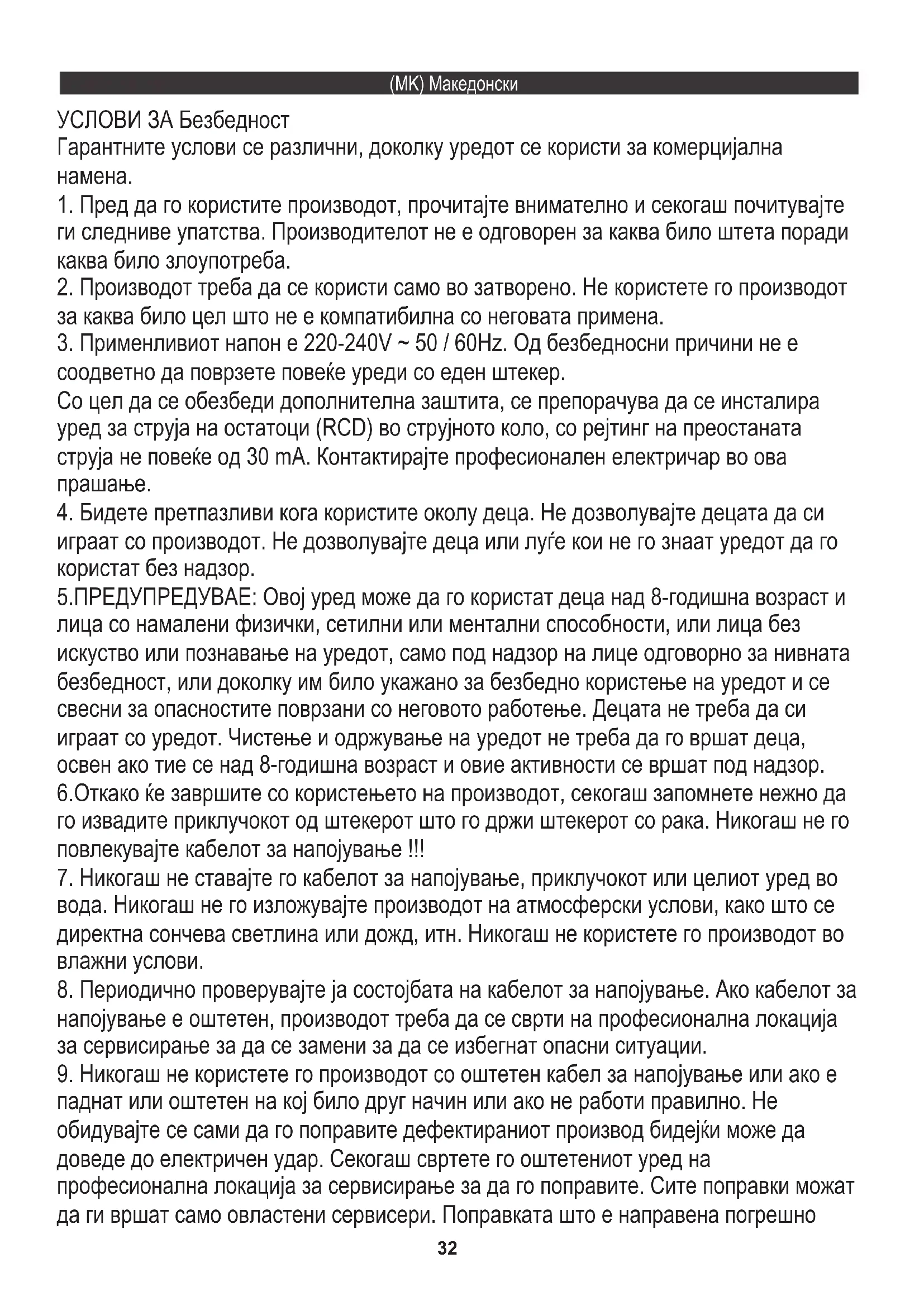 ги следниве упатства. Производителот не е одговорен за каква било штета поради каква било злоупотреба. 5.ПРЕДУПРЕДУВАЕ: Овој уред може да го користат деца над 8-годишна возраст и лица со намалени физички, сетилни или ментални способности, или лица без искуство или познавање на уредот, само под надзор на лице одговорно за нивната безбедност, или доколку им било укажано за безбедно користење на уредот и се свесни за опасностите поврзани со неговото работење. Децата не треба да си играат со уредот. Чистење и одржување на уредот не треба да го вршат деца, освен ако тие се над 8-годишна возраст и овие активности се вршат под надзор.