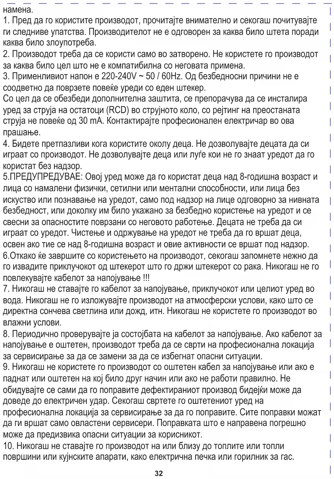 играат со производот. Не дозволувајте деца или луѓе кои не го знаат уредот да го користат без надзор. 5.ПРЕДУПРЕДУВАЕ: Овој уред може да го користат деца над 8-годишна возраст и лица со намалени физички, сетилни или ментални способности, или лица без искуство или познавање на уредот, само под надзор на лице одговорно за нивната безбедност, или доколку им било укажано за безбедно користење на уредот и се свесни за опасностите поврзани со неговото работење. Децата не треба да си играат со уредот. Чистење и одржување на уредот не треба да го вршат деца, освен ако тие се над 8-годишна возраст и овие активности се вршат под надзор. 6.Откако ќе завршите со користењето на производот, секогаш запомнете нежно да го извадите приклучокот од штекерот што го држи штекерот со рака. Никогаш не го повлекувајте кабелот за напојување !!!