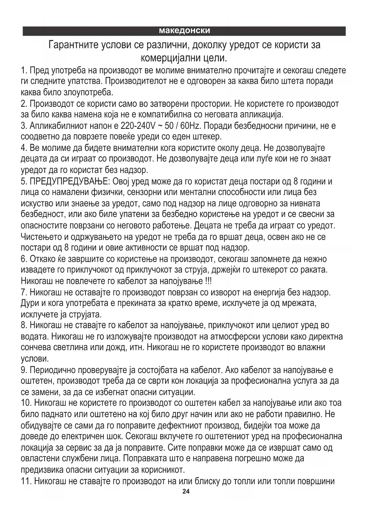 извадете го приклучокот од приклучокот за струја, држејќи го штекерот со раката. Никогаш не повлечете го кабелот за напојување !!! Гарантните услови се различни, доколку уредот се користи за комерцијални цели.