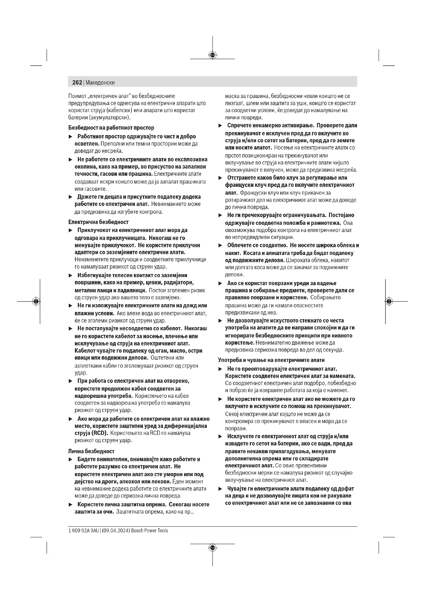Прочитајте ги сите безбедносни предупредувања, илустрации и спецификации приложени со овој електричен алат. Непридржувањето до сите упатства приложени подолу може да доведе до струен удар, пожар и/или тешки повреди. Зачувајте ги безбедносните предупредувања и упатства за користење и за во иднина. Bosch Power Tools 1 609 92A 9AU | (09.04.2024)262 | Македонски Поимот „електричен алат“ во безбедносните предупредувања се однесува на електрични апарати што користат струја (кабелски) или апарати што користат батерии (акумулаторски). Безбедност на работниот простор u Работниот простор одржувајте го чист и добро осветлен. Преполни или темни простории може да доведат до несреќа. u Не работете со електричните алати во експлозивна околина, како на пример, во присуство на запаливи течности, гасови или прашина. Електричните алати создаваат искри коишто може да ја запалат прашината или гасовите. u Држете ги децата и присутните подалеку додека работите со електричен алат. Невниманието може да предизвика да изгубите контрола. Електрична безбедност u Приклучокот на електричниот алат мора да одговара на приклучницата. Никогаш не го менувајте приклучокот. Не користите приклучни адаптери со заземјените електрични алати. Неизменетите приклучоци и соодветните приклучници го намалуваат ризикот од струен удар. u Избегнувајте телесен контакт со заземјени површини, како на пример, цевки, радијатори, метални ланци и ладилници. Постои зголемен ризик од струен удар ако вашето тело е заземјено. u Не ги изложувајте електричните алати на дожд или влажни услови. Ако влезе вода во електричниот алат, ќе се зголеми ризикот од струен удар. u Не постапувајте несоодветно со кабелот. Никогаш не го користете кабелот за носење, влечење или исклучување од струја на електричниот алат. Кабелот чувајте го подалеку од оган, масло, остри ивици или подвижни делови. Оштетени или заплеткани кабли го зголемуваат ризикот од струен