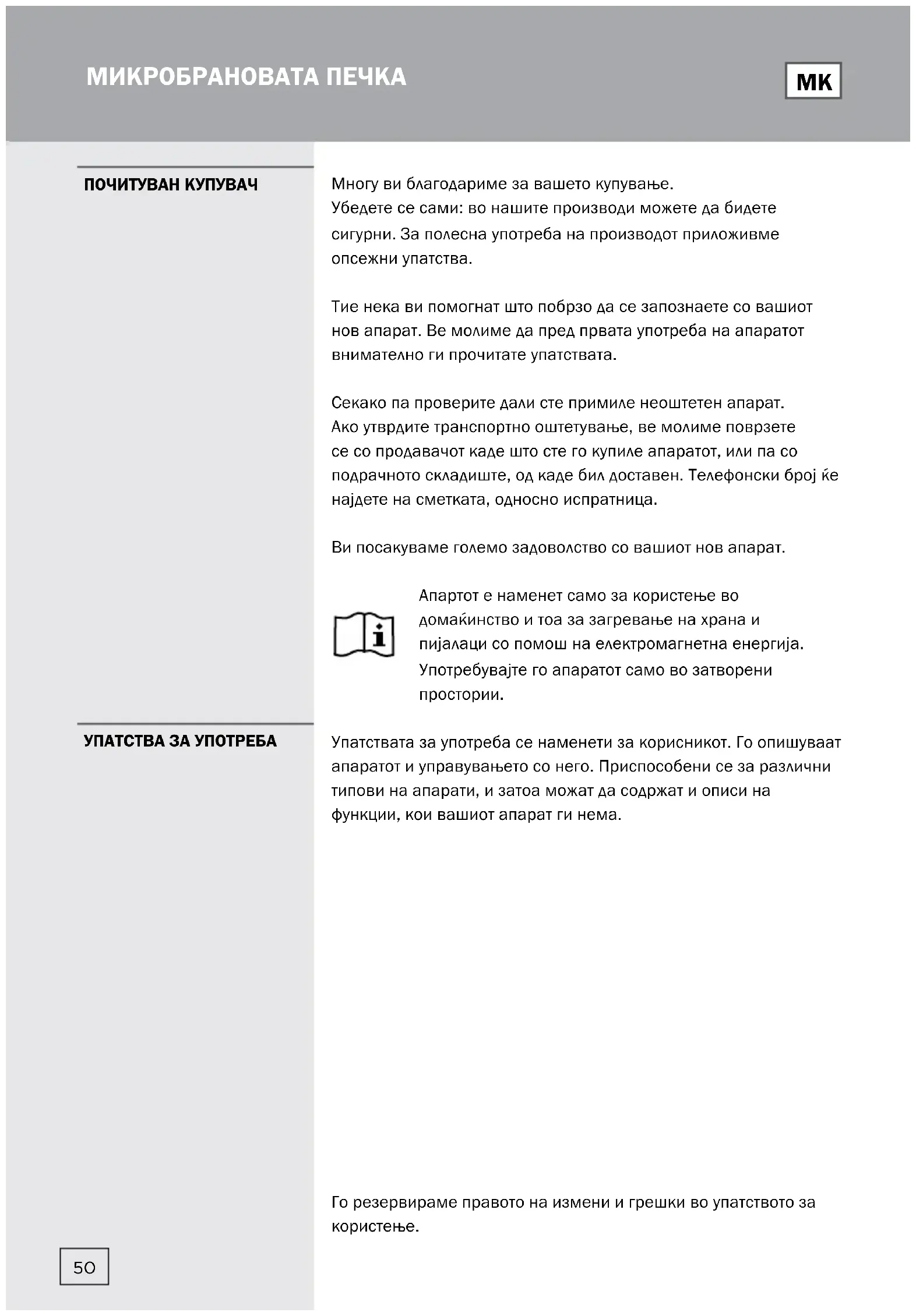 PRE NEGO ŠTO POZOVETE SERVISERAМногу ви благодариме за вашето купување. Убедете се сами: во нашите производи можете да бидете сигурни. За полесна употреба на производот приложивме опсежни упатства. Тие нека ви помогнат што побрзо да се запознаете со вашиот нов апарат. Ве молиме да пред првата употреба на апаратот внимателно ги прочитате упатствата. Секако па проверите дали сте примиле неоштетен апарат. Ако утврдите транспортно оштетување, ве молиме поврзете се со продавачот каде што сте го купиле апаратот, или па со подрачното складиште, од каде бил доставен. Телефонски број ќе најдете на сметката, односно испратница. Ви посакуваме големо задоволство со вашиот нов апарат. Апартот е наменет само за користење во домаќинство и тоа за загревање на храна и пијалаци со помош на електромагнетна енергија. Употребувајте го апаратот само во затворени