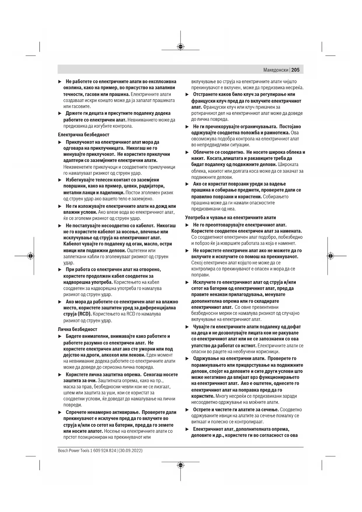 Прочитајте ги сите напомени и упатства за безбедност. Грешките настанати како резултат од непридржување до безбедносните напомени и упатства може да предизвикаат електричен удар, пожар и/или тешки повреди. Зачувајте ги безбедносните предупредувања и упатства за користење и за во иднина. Поимот „електричен алат“ во безбедносните предупредувања се однесува на електрични апарати што користат струја (кабелски) или апарати што користат батерии (акумулаторски). Безбедност на работниот простор u Работниот простор одржувајте го чист и добро осветлен. Преполни или темни простории може да доведат до несреќа. 1 609 92A 824 | (30.09.2022) Bosch Power ToolsМакедонски | 205 u Не работете со електричните алати во експлозивна околина, како на пример, во присуство на запаливи течности, гасови или прашина. Електричните алати создаваат искри коишто може да ја запалат прашината или гасовите. u Држете ги децата и присутните подалеку додека работите со електричен алат. Невниманието може да предизвика да изгубите контрола. Електрична безбедност u Приклучокот на електричниот алат мора да одговара на приклучницата. Никогаш не го менувајте приклучокот. Не користите приклучни адаптери со заземјените електрични алати. Неизменетите приклучоци и соодветните приклучници го намалуваат ризикот од струен удар. u Избегнувајте телесен контакт со заземјени површини, како на пример, цевки, радијатори, метални ланци и ладилници. Постои зголемен ризик од струен удар ако вашето тело е заземјено. u Не ги изложувајте електричните алати на дожд или влажни услови. Ако влезе вода во електричниот алат, ќе се зголеми ризикот од струен удар. u Не постапувајте несоодветно со кабелот. Никогаш не го користете кабелот за носење, влечење или исклучување од струја на електричниот алат. Кабелот чувајте го подалеку од оган, масло, остри ивици или подвижни делови. Оштетени или заплеткани кабли го зголемуваат ризикот од струен