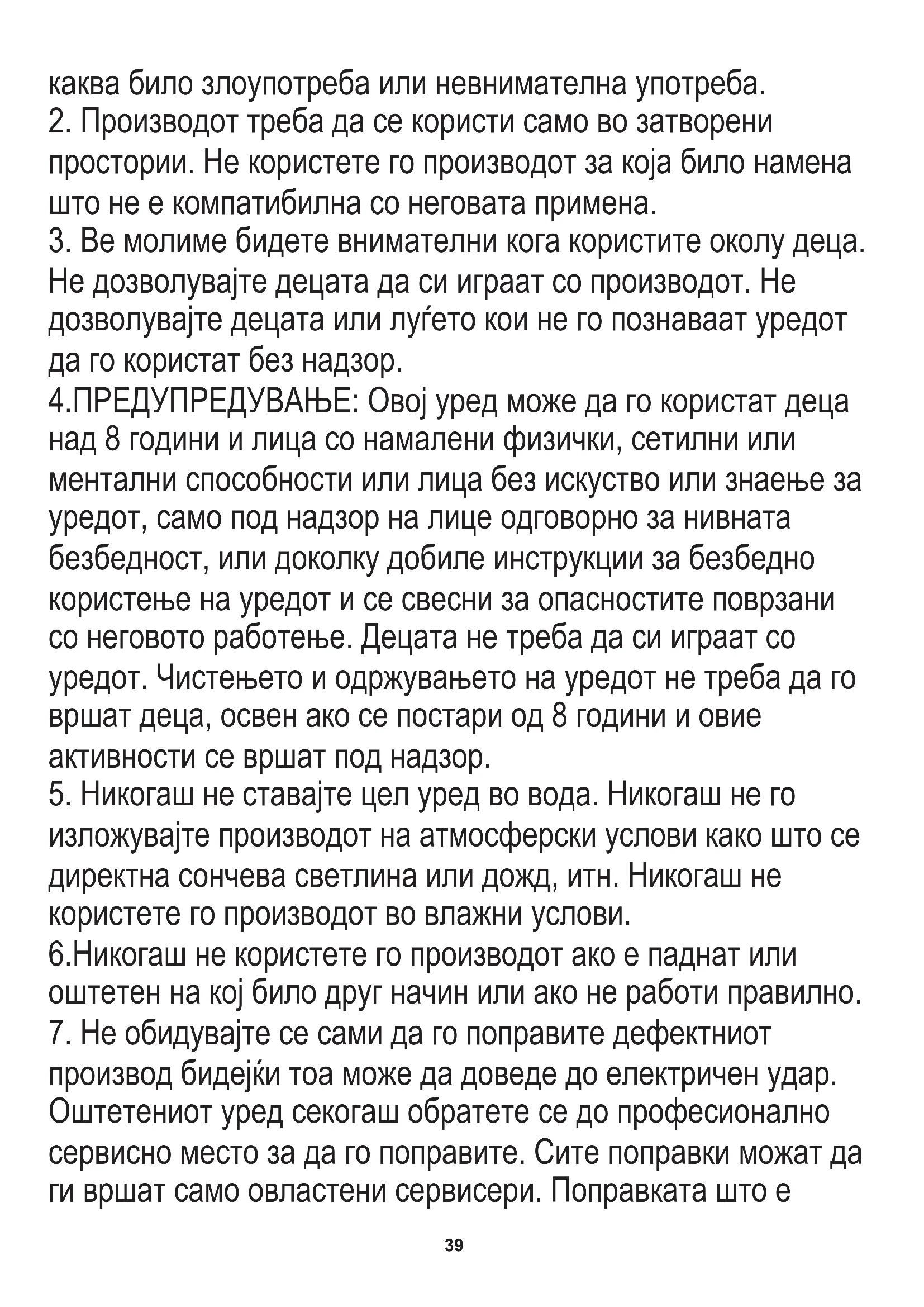 Не дозволувајте децата да си играат со производот. Не дозволувајте децата или луѓето кои не го познаваат уредот да го користат без надзор. 4.ПРЕДУПРЕДУВАЊЕ: Овој уред може да го користат деца над 8 години и лица со намалени физички, сетилни или ментални способности или лица без искуство или знаење за уредот, само под надзор на лице одговорно за нивната безбедност, или доколку добиле инструкции за безбедно користење на уредот и се свесни за опасностите поврзани со неговото работење. Децата не треба да си играат со уредот. Чистењето и одржувањето на уредот не треба да го вршат деца, освен ако се постари од 8 години и овие активности се вршат под надзор.