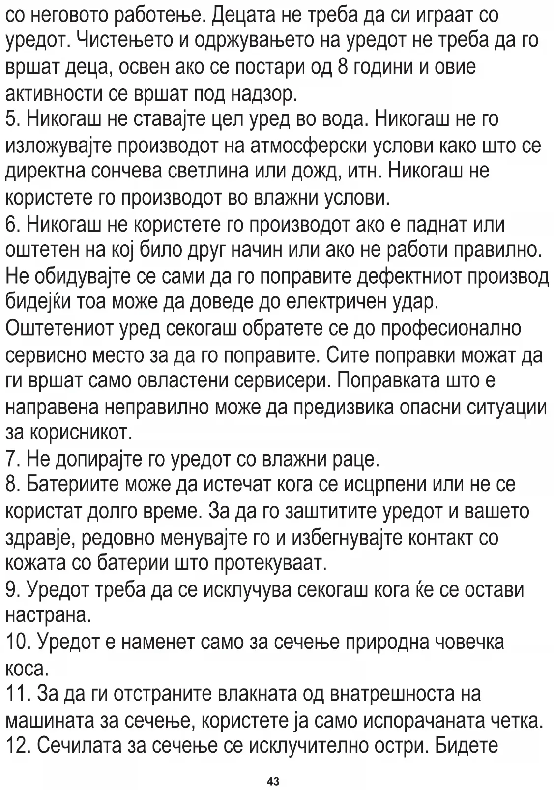 Не дозволувајте децата да си играат со производот. Не дозволувајте децата или луѓето кои не го познаваат уредот да го користат без надзор. 4.ПРЕДУПРЕДУВАЊЕ: Овој уред може да го користат деца над 8 години и лица со намалени физички, сетилни или ментални способности или лица без искуство или знаење за уредот, само под надзор на лице одговорно за нивната безбедност, или доколку добиле инструкции за безбедно користење на уредот и се свесни за опасностите поврзани ОПШТИ БЕЗБЕДНОСНИ УСЛОВИ