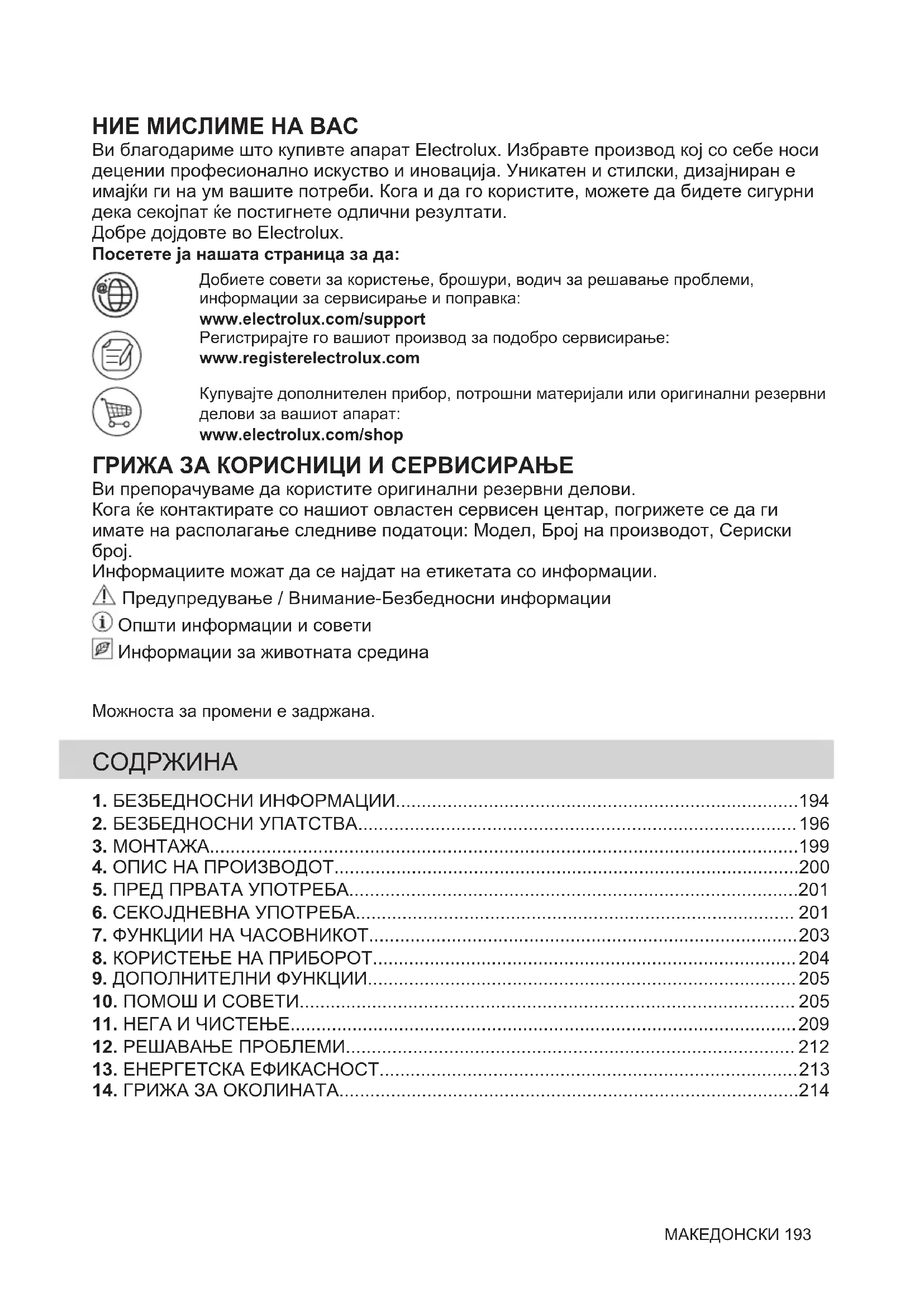 Ако не можете самите да го решите проблемот, обратете се кај Вашиот дилер или во овластениот сервисен центар. Потребните податоци за сервисниот центар се на плочката со спецификации. Плочката со спецификации е на предната рамка на внатрешноста на апаратот. Не отстранувајте ја плочката со спецификации од внатрешноста на апаратот. Препорачуваме овде да ги запишете податоците: Модел (MOD.) ......................................... 212 МАКЕДОНСКИПрепорачуваме овде да ги запишете податоците: Број на производ (PNC) ......................................... Сериски број (SN.) .........................................