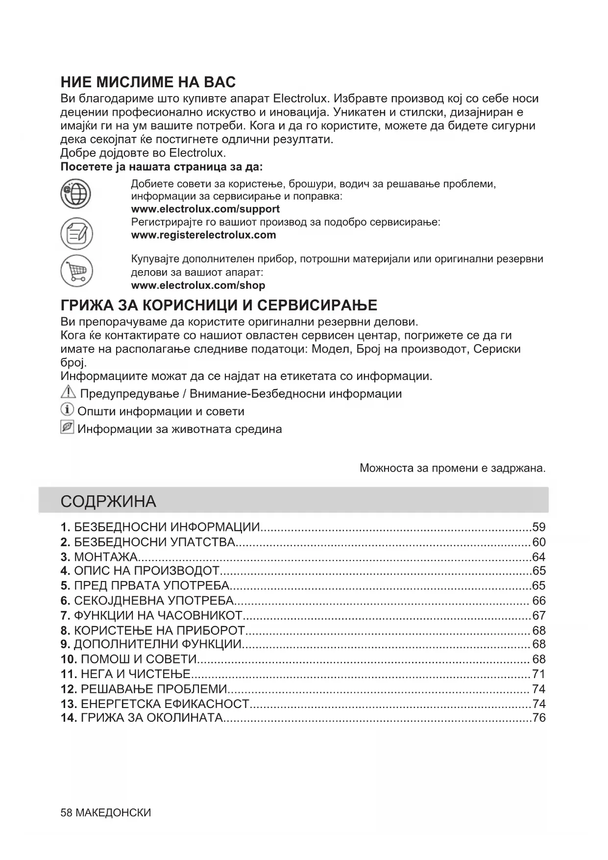 Riciclare i materiali con il simbolo . Buttare l'imballaggio negli appositi contenitori per il riciclaggio. Aiutare a proteggere l’ambiente e la salute umana e a riciclare rifiuti derivanti da apparecchiature elettriche ed elettroniche. Non smaltire le apparecchiature che riportano il simbolo insieme ai normali rifiuti domestici. Portare il prodotto al punto di riciclaggio più vicino o contattare il comune di residenza. ITALIANO 57НИЕ МИСЛИМЕ НА ВАС Ви благодариме што купивте апарат Electrolux. Избравте производ кој со себе носи децении професионално искуство и иновација. Уникатен и стилски, дизајниран е имајќи ги на ум вашите потреби. Кога и да го користите, можете да бидете сигурни дека секојпат ќе постигнете одлични резултати. Добре дојдовте во Electrolux. Посетете ја нашата страница за да: Добиете совети за користење, брошури, водич за решавање проблеми, информации за сервисирање и поправка: www.electrolux.com/support Регистрирајте го вашиот производ за подобро сервисирање: www.registerelectrolux.com Купувајте дополнителен прибор, потрошни материјали или оригинални резервни делови за вашиот апарат: www.electrolux.com/shop ГРИЖА ЗА КОРИСНИЦИ И СЕРВИСИРАЊЕ Ви препорачуваме да користите оригинални резервни делови. Кога ќе контактирате со нашиот овластен сервисен центар, погрижете се да ги имате на располагање следниве податоци: Модел, Број на производот, Сериски