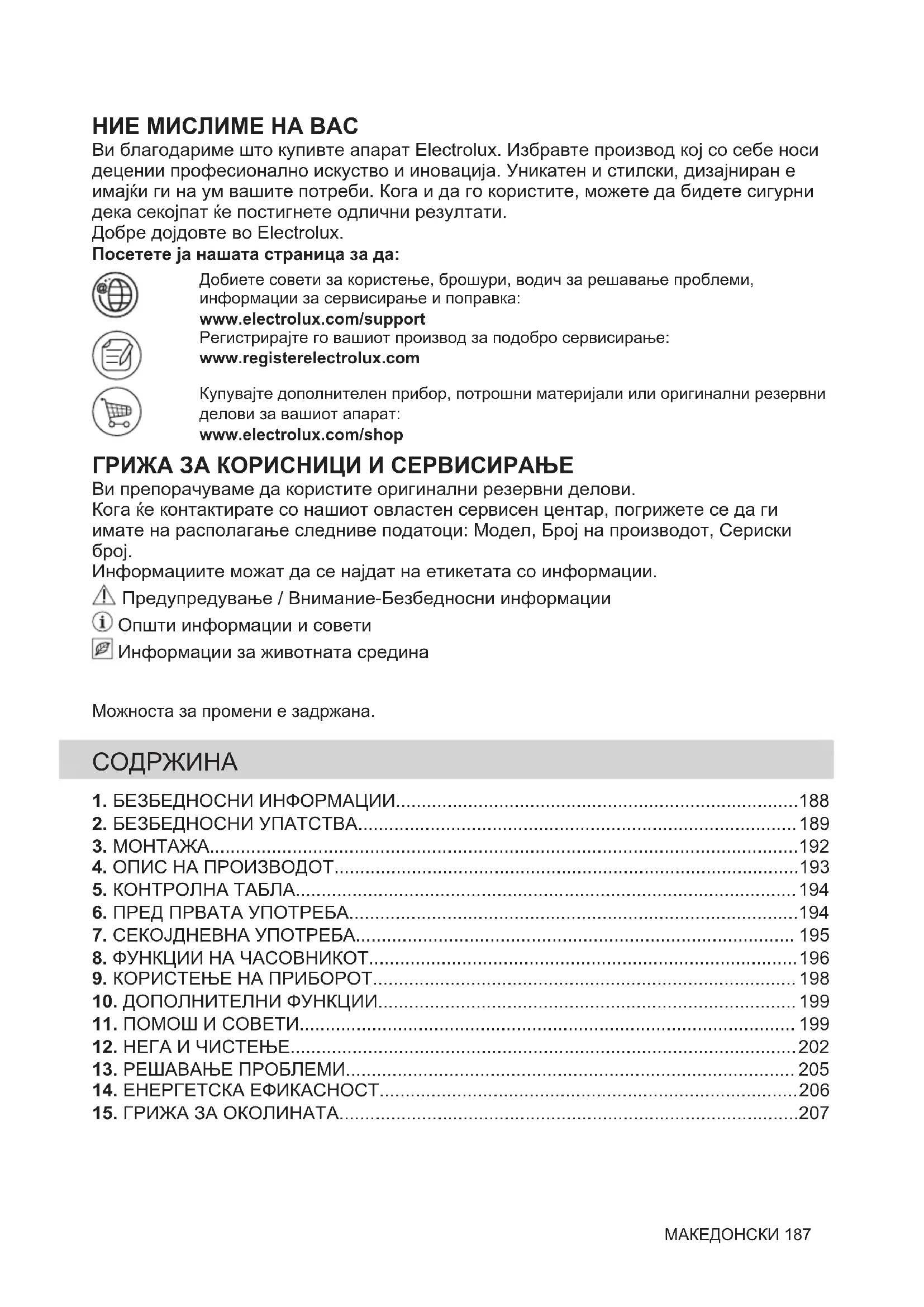 За да одредите колку долго работи печката. Потсетник во минути За да поставите одбројување Оваа функција нема ефект на работата на печката. Можете да поставите функција кога било, дури и кога печката е исклучена. 196 МАКЕДОНСКИ8.2 Како да поставите: Функции на часовникот Како да поставите: Време во денот - трепка кога ќе го поврзите апаратот со електрична струја, кога има прекин на струја или кога не е подесен тајмерот. Притиснете , - за да го нагодите точното време. По околу 5 секунди, трепкањето престанува и на екранот се прикажува поставеното време. Како да смените: Време во денот Чекор 1 - притиснете неколкупати за да го смените точното време. - започнува да трепка. Чекор 2 Притиснете , - за да го нагодите точното време. По околу 5 секунди, трепкањето престанува и на екранот се прикажува поставеното време. Како да поставите: Траење Чекор 1 Поставете ги функцијата на печката и температурата. Чекор 2 - притиснете неколку пати. - започнува да трепка. Чекор 3 Притиснете , - за да го нагодите времетраењето. На екранот се прикажува: . - трепка кога ќе заврши поставеното време. Се огласува сигнал и печката запира. Чекор 4 Притиснете кое било копче за да го исклучите звучниот сигнал. Чекор 5 Свртете го копчето на тајмерот до позиција на исклучено. Како да поставите: Потсетник во минути Чекор 1 - притиснете неколку пати. - започнува да трепка. Чекор 2 Притиснете , - за да го нагодите точното време. Функцијата стартува автомастки после 5 секунди. Кога ќе истече поставеното време, се огласува звучен сигнал. Чекор 3 Притиснете кое било копче за да го исклучите звучниот сигнал. Чекор 4 Свртете го копчето на тајмерот до позиција на исклучено. Како да откажете: Функции на часовникот Чекор 1 - притискате постојано додека симболот на функцијата на часовникот не почне да трепа. Чекор 2 Притиснете и држете: . Функцијата часовник се исклучува по неколку секунди. МАКЕДОНСКИ 1979. КОРИСТЕЊЕ НА ПРИБОРОТ ПРЕДУПРЕДУВАЊЕ! Видете во поглавјата за заштита и сигурност.