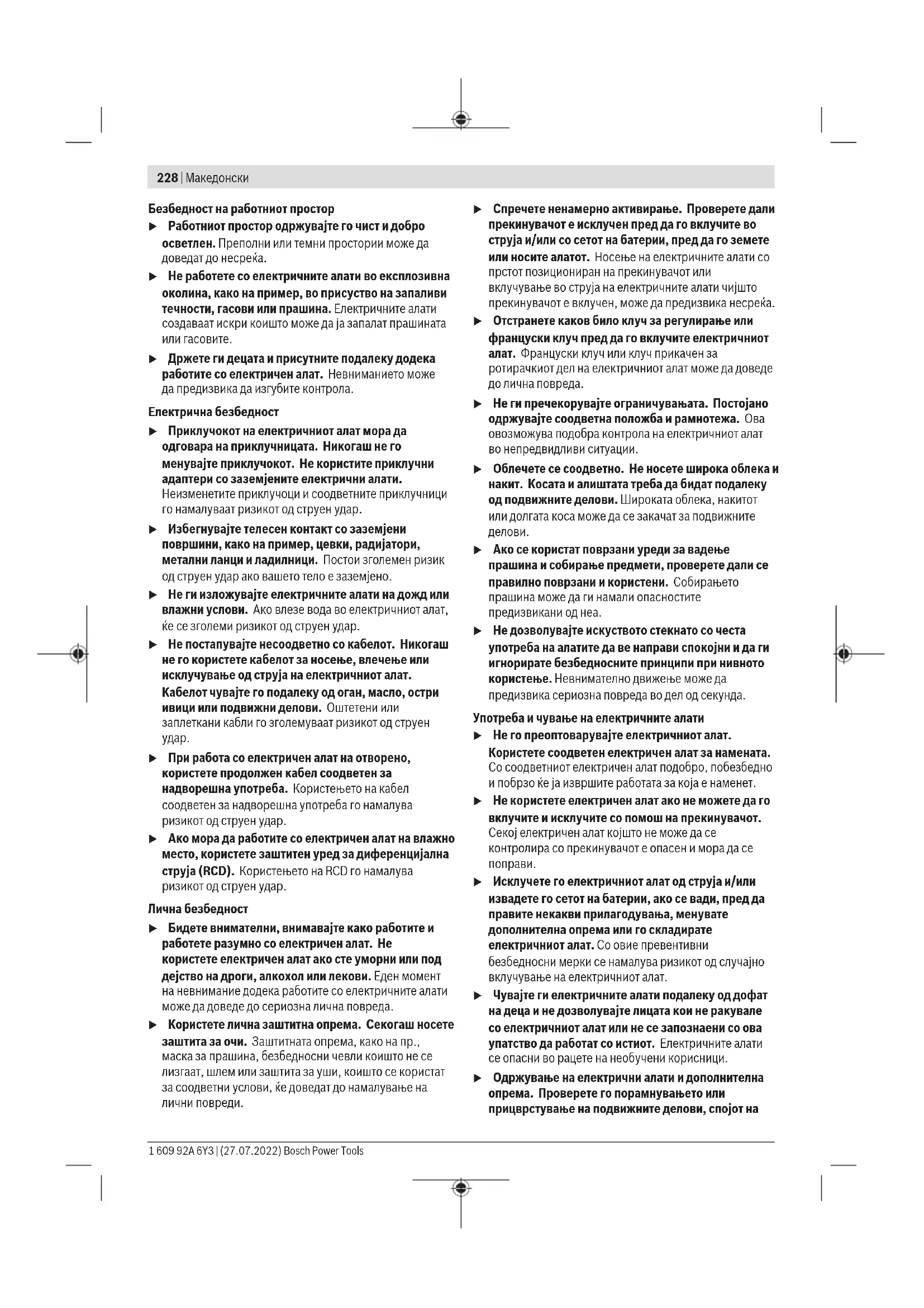 Прочитајте ги сите безбедносни предупредувања, илустрации и спецификации приложени со овој електричен алат. Непридржувањето до сите упатства приложени подолу може да доведе до струен удар, пожар и/или тешки повреди. Зачувајте ги безбедносните предупредувања и упатства за користење и за во иднина. Поимот „електричен алат“ во безбедносните предупредувања се однесува на електрични апарати што користат струја (кабелски) или апарати што користат батерии (акумулаторски). Bosch Power Tools 1 609 92A 6Y3 | (27.07.2022)228 | Македонски Безбедност на работниот простор u Работниот простор одржувајте го чист и добро осветлен. Преполни или темни простории може да доведат до несреќа. u Не работете со електричните алати во експлозивна околина, како на пример, во присуство на запаливи течности, гасови или прашина. Електричните алати создаваат искри коишто може да ја запалат прашината или гасовите. u Држете ги децата и присутните подалеку додека работите со електричен алат. Невниманието може да предизвика да изгубите контрола. Електрична безбедност u Приклучокот на електричниот алат мора да одговара на приклучницата. Никогаш не го менувајте приклучокот. Не користите приклучни адаптери со заземјените електрични алати. Неизменетите приклучоци и соодветните приклучници го намалуваат ризикот од струен удар. u Избегнувајте телесен контакт со заземјени површини, како на пример, цевки, радијатори, метални ланци и ладилници. Постои зголемен ризик од струен удар ако вашето тело е заземјено. u Не ги изложувајте електричните алати на дожд или влажни услови. Ако влезе вода во електричниот алат, ќе се зголеми ризикот од струен удар. u Не постапувајте несоодветно со кабелот. Никогаш не го користете кабелот за носење, влечење или исклучување од струја на електричниот алат. Кабелот чувајте го подалеку од оган, масло, остри ивици или подвижни делови. Оштетени или заплеткани кабли го зголемуваат ризикот од струен