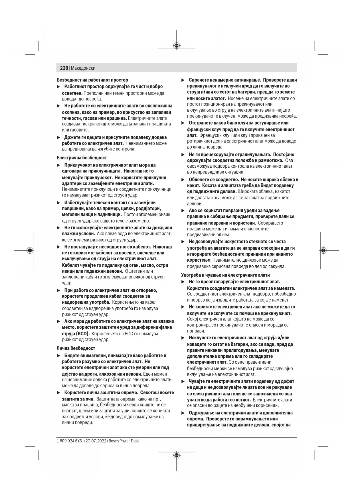 Прочитајте ги сите безбедносни предупредувања, илустрации и спецификации приложени со овој електричен алат. Непридржувањето до сите упатства приложени подолу може да доведе до струен удар, пожар и/или тешки повреди. Зачувајте ги безбедносните предупредувања и упатства за користење и за во иднина. Поимот „електричен алат“ во безбедносните предупредувања се однесува на електрични апарати што користат струја (кабелски) или апарати што користат батерии (акумулаторски). Bosch Power Tools 1 609 92A 6Y3 | (27.07.2022)228 | Македонски Безбедност на работниот простор u Работниот простор одржувајте го чист и добро осветлен. Преполни или темни простории може да доведат до несреќа. u Не работете со електричните алати во експлозивна околина, како на пример, во присуство на запаливи течности, гасови или прашина. Електричните алати создаваат искри коишто може да ја запалат прашината или гасовите. u Држете ги децата и присутните подалеку додека работите со електричен алат. Невниманието може да предизвика да изгубите контрола. Електрична безбедност u Приклучокот на електричниот алат мора да одговара на приклучницата. Никогаш не го менувајте приклучокот. Не користите приклучни адаптери со заземјените електрични алати. Неизменетите приклучоци и соодветните приклучници го намалуваат ризикот од струен удар. u Избегнувајте телесен контакт со заземјени површини, како на пример, цевки, радијатори, метални ланци и ладилници. Постои зголемен ризик од струен удар ако вашето тело е заземјено. u Не ги изложувајте електричните алати на дожд или влажни услови. Ако влезе вода во електричниот алат, ќе се зголеми ризикот од струен удар. u Не постапувајте несоодветно со кабелот. Никогаш не го користете кабелот за носење, влечење или исклучување од струја на електричниот алат. Кабелот чувајте го подалеку од оган, масло, остри ивици или подвижни делови. Оштетени или заплеткани кабли го зголемуваат ризикот од струен