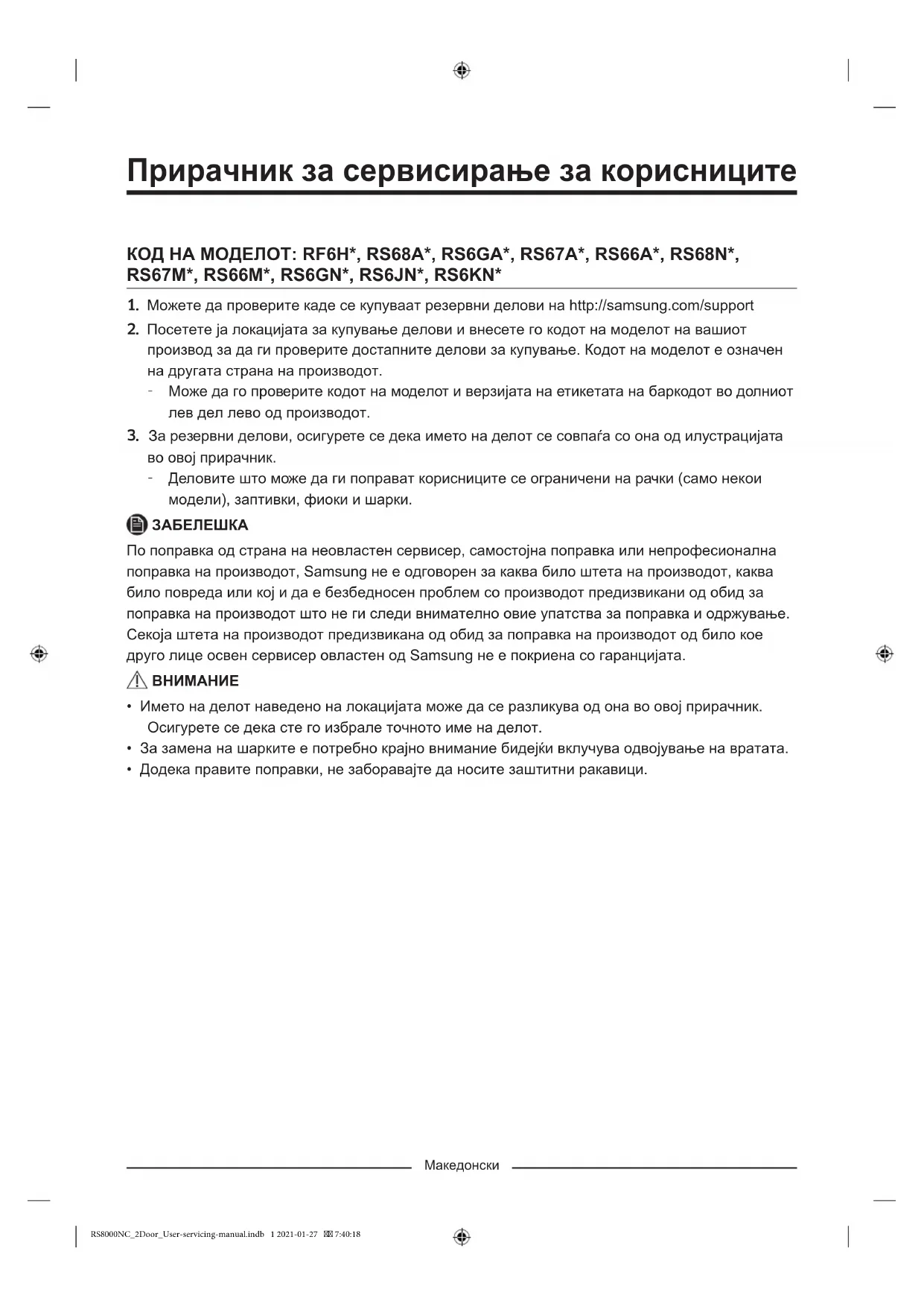 - Додека правите поправки, не заборавајте да носите заштитни ракавици. RS8000NC_2Door_User-servicing-manual.indb 1 2021-01-27 7:40:18Македонски Фактичкиот изглед и обезбедените делови на фрижидерот може да се разликуваат, зависно од моделот и земјата.