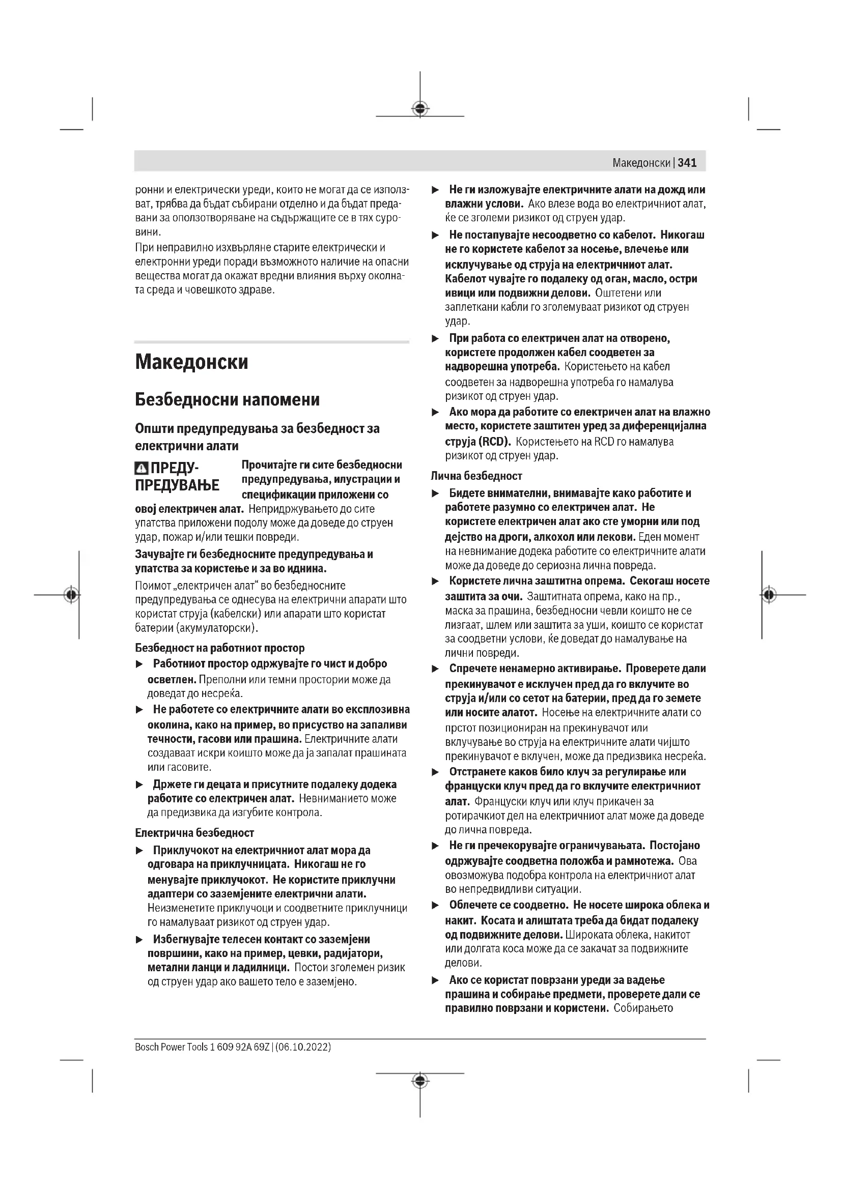 u Не го вклучувајте електричниот алат додека го држите свртен кон вас. Случаен контакт со ротирачка дополнителна опрема може да ја закачи вашата облека, со повлекување на дополнителната опрема кон вашето тело. u Редовно чистете ги воздушните вентили на електричниот алат. Вентилаторот на моторот повлекува прав во куќиштето, а претераната акумулација на метален прав може да предизвика опасност од електричен удар. u Не работете со електричниот алат во близина на запаливи материјали. Искрите можат да ги запалат овие материјали. u Не користете дополнителна опрема за која се потребни течни разладувачи. Користењето вода или други течни разладувачи може да доведе до смрт или струен удар. Предупредувања за одбивање и слични предупредувања: Одбивање е ненадејна реакција на приклештен или закачен ротирачки диск, потпорен диск, четка или друга дополнителна опрема. Приклештувањето или закачувањето предизвикува брзо маневрирање на ротационата дополнителна опрема, кое од друга страна, предизвикува присилно насочување на неконтролираниот електричен алат во спротивен правец од ротирањето на опремата во точката на навалување. На пример, ако абразивен диск е закачен или приклештен од делот што го обработувате, острицата на дискот која влегува во приклештената точка може да се зарие во површината на материјалот и дискот да се помести или ослободи. Дискот може да скокне или одбие од операторот, во зависност од насоката на движење на дискот во точката на приклештување. Абразивните дискови, исто така, може да се искршат под овие услови. Одбивањето е резултат на погрешна употреба и/или несоодветни оперативни постапки или услови и може да се избегне со преземање на соодветните превентивни мерки приложени подолу. u Цврсто држете го електричниот алат и поставете го телото и рацете така што ќе овозможите отпор на силите на одбивање. Секогаш користете помошна рачка, доколку има, за максимална контрола на одбивањето или силата на вртење при вклучување. Операторот може да ги контролира реакциите на силата на вртење или силите на одбивање, доколку се преземат соодветни превентивни мерки. u Не ја ставајте раката во близина на ротирачката дополнителна опрема. Дополнителната опрема може да се одбие преку вашата рака. u Не го позиционирајте вашето тело во областа каде електричниот алат се движи, доколку настане одбивање. Одбивањето ќе го придвижи алатот во спротивен правец од движењето на дискот во точката на закачување. u Обрнете посебно внимание при изработка на агли, остри рабови и др. Избегнувајте отскокнување и закачување на дополнителната опрема. Аглите, острите рабови или отскокнувањето може да доведат до закачување на дополнителната опрема и да предизвикаат губење на контрола или одбивање. u Не закачувајте сечило за длабење, сегментирани дијамантски дискови со периферна празнина поголема од 10mm или назабено сечило за пила. Овие сечила предизвикуваат брзи одбивања и губење на контрола. Безбедносни предупредувања специфични за брусење и сечење: u Користете само видови на дискови специјално наменети за вашиот електричен алат и соодветната Bosch Power Tools 1 609 92A 69Z | (06.10.2022)344 | Македонски заштита за избраниот диск. Дискови коишто не се дизајнирани за дадениот електричен алат не може соодветно да се заштитат и не се безбедни. u Површината за брусење на цент