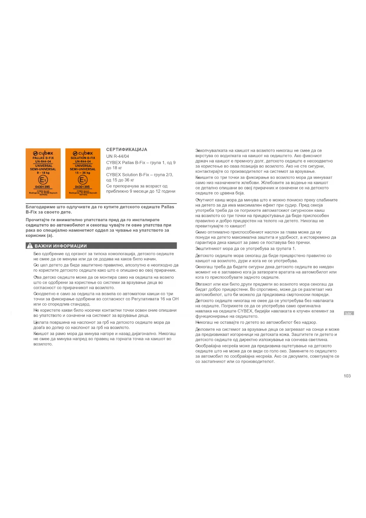 СЕРТИФИКАЦИЈА UN R-44/04 CYBEX Pallas B-Fix – група 1, од 9 до 18 кг CYBEX Solution B-Fix – група 2/3, од 15 до 36 кг Се препорачува за возраст од приближно 9 месеци до 12 години Благодариме што одлучивте да го купите детското седиште Pallas B-Fix за своето дете. Прочитајте ги внимателно упатствата пред да го инсталирате седиштето во автомобилот и секогаш чувајте ги овие упатства при рака во специјално наменетиот оддел за чување на упатството за корисник (a). ВАЖНИ ИНФОРМАЦИИ
