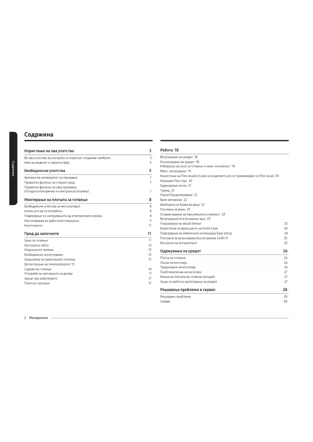 Работа 18 Вклучување на уредот 18 Исклучување на уредот 18 Избирање на зона за готвење и ниво на моќност 18 Макс. засилување 19 Користење на Flex зоната (Само за моделите што се применуваат со Flex зона) 20 Функции Flex плус 20 Одржување топло 21 Тајмер 21 Пауза/Продолжување 22 Брзо запирање 22 Безбедносна брава за деца 22 Поставка за јазик 23 Ограничување на максималната моќност 23 Вклучување/исклучување звук 23 Поврзување на Assist Sensor 23 Користење на функциите на Assist Cook 24 Поврзување на мобилната апликација Easy Setup 24 Поставки за вклучување/исклучување на Wi-Fi 25 Контрола на аспираторот 25 Одржување на уредот 26 Плоча за готвење 26 Лесна нечистотија 26 Тврдокорна нечистотија 26 Проблематична нечистотија 27 Рамка на плочата за готвење (опција) 27 За да се избегне оштетување на уредот 27 Решавање проблеми и сервис 28 Решавање проблеми 28 Сервис 30