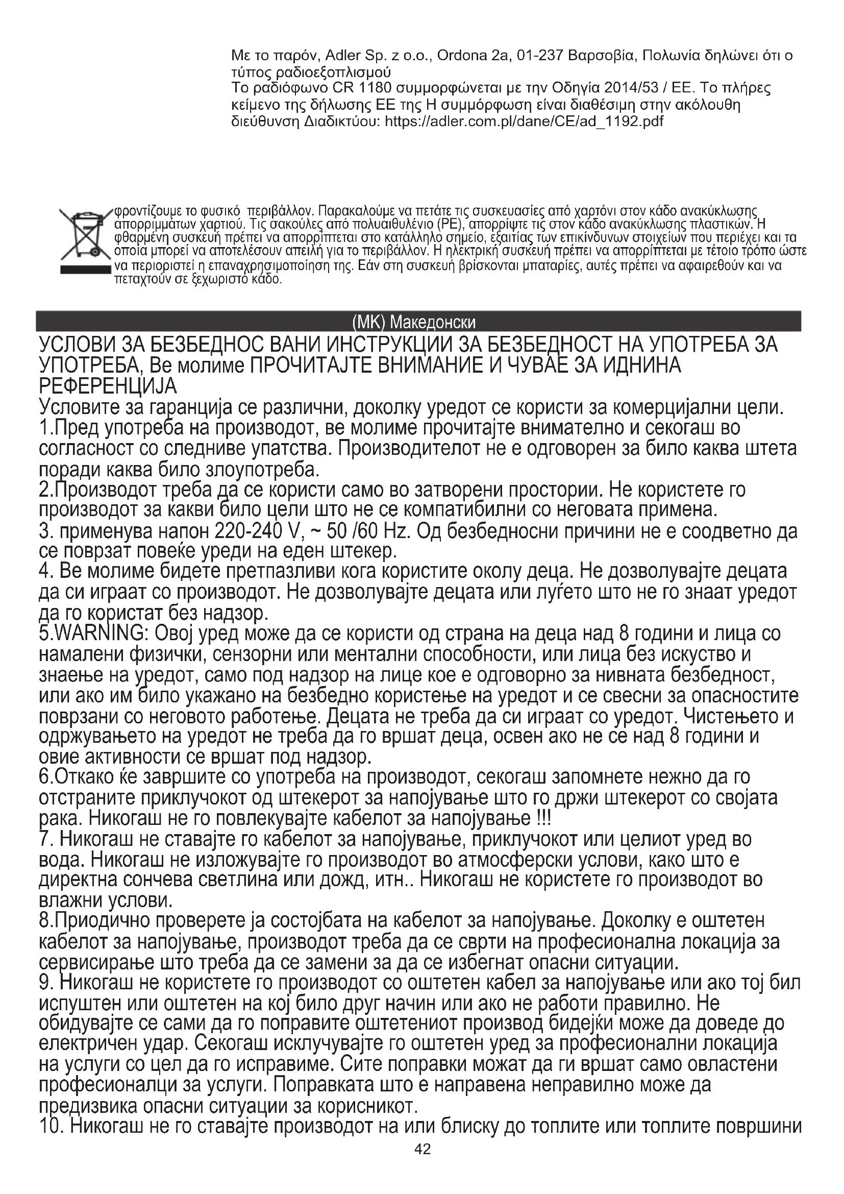 Пронајдете бесплатно прирачникот за уредот AD 1192 ADLER во PDF формат.