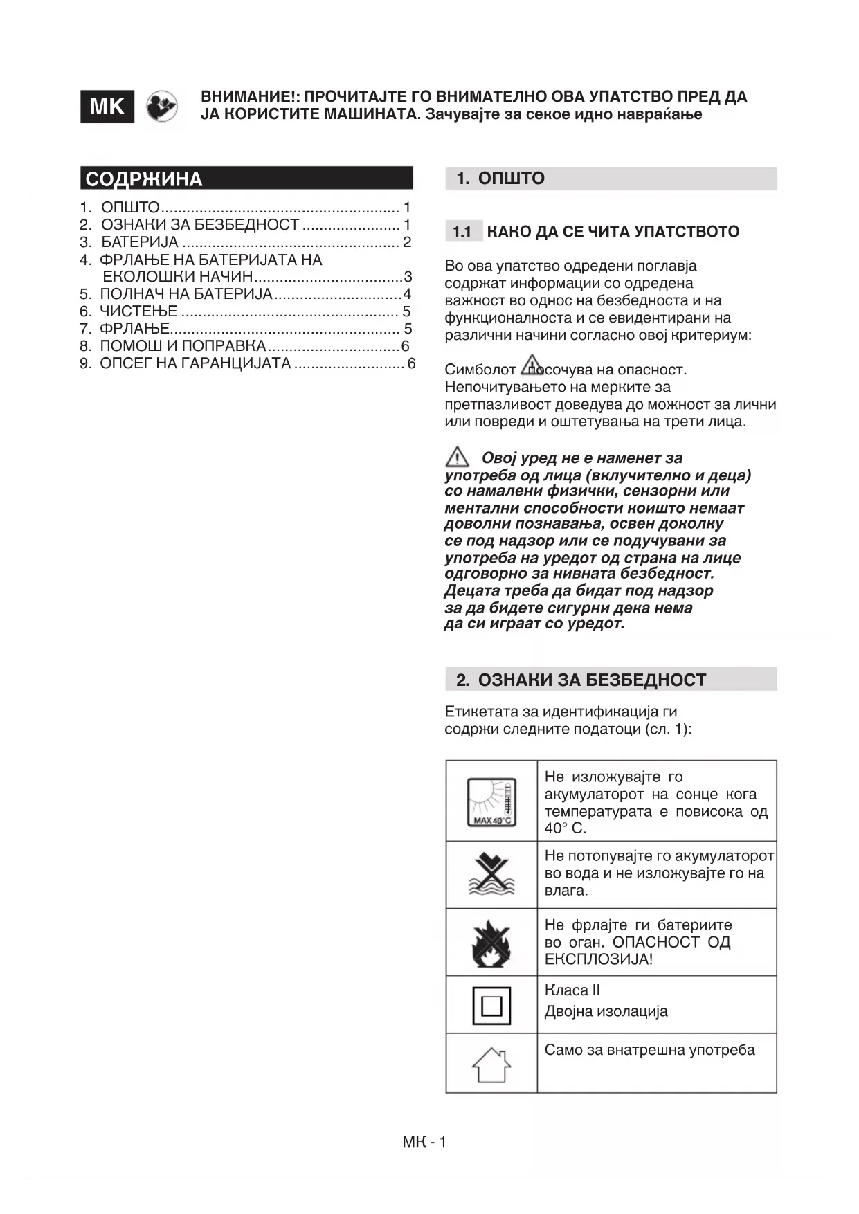 Батеријата / полнач - УПАТСТВА ЗА УПОТРЕБА ВНИМАНИЕ: прочитајте го внимателно ова упатство пред да ја користите машината.
