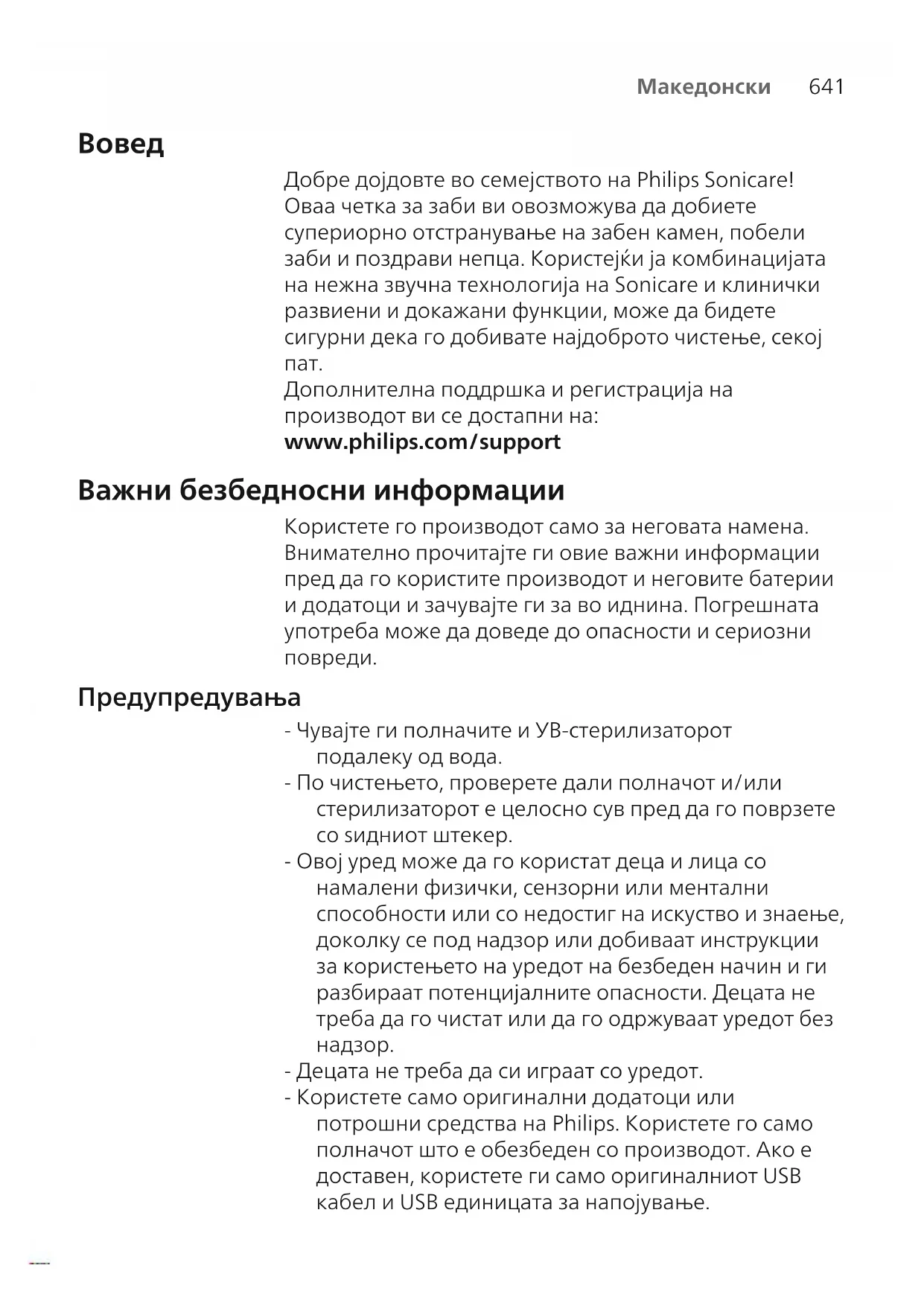 - Користете го производот само за неговата намена. Внимателно прочитајте ги овие информации пред да ги користите производот и неговите батерии и додатоци и зачувајте ги за во иднина. Погрешната употреба може да доведе до опасности и сериозни повреди. Доставените додатоци може да се разликуваат за различни производи. - Користете само оригинални додатоци и потрошни средства на Philips. Користете ја само единицата за напојување што се вади TCBxxxx, HX6100, HX6110, HX6160 или WAAxxxx. - Чувајте ги производот и батериите подалеку од оган и немојте да ги изложувате на директна сончева светлина или високи температури. - Ако производот се загрее премногу или почне да мириса, ја промени бојата или ако полнењето трае подолго од вообичаено, престанете со користењето и полнењето на производот и контактирајте со Philips. - Не ставајте ги производите и нивните батерии во микробранови печки или на индукциски шпорети. - Немојте да го отворате, изменувате, продупчувате, оштетувате или расклопувате производот или батеријата за да спречите батериите да се загреваат или да испуштаат токсични или опасни супстанции. Немојте да правите краток спој, премногу да ги наполнувате или обратно да ги полните батериите.644
