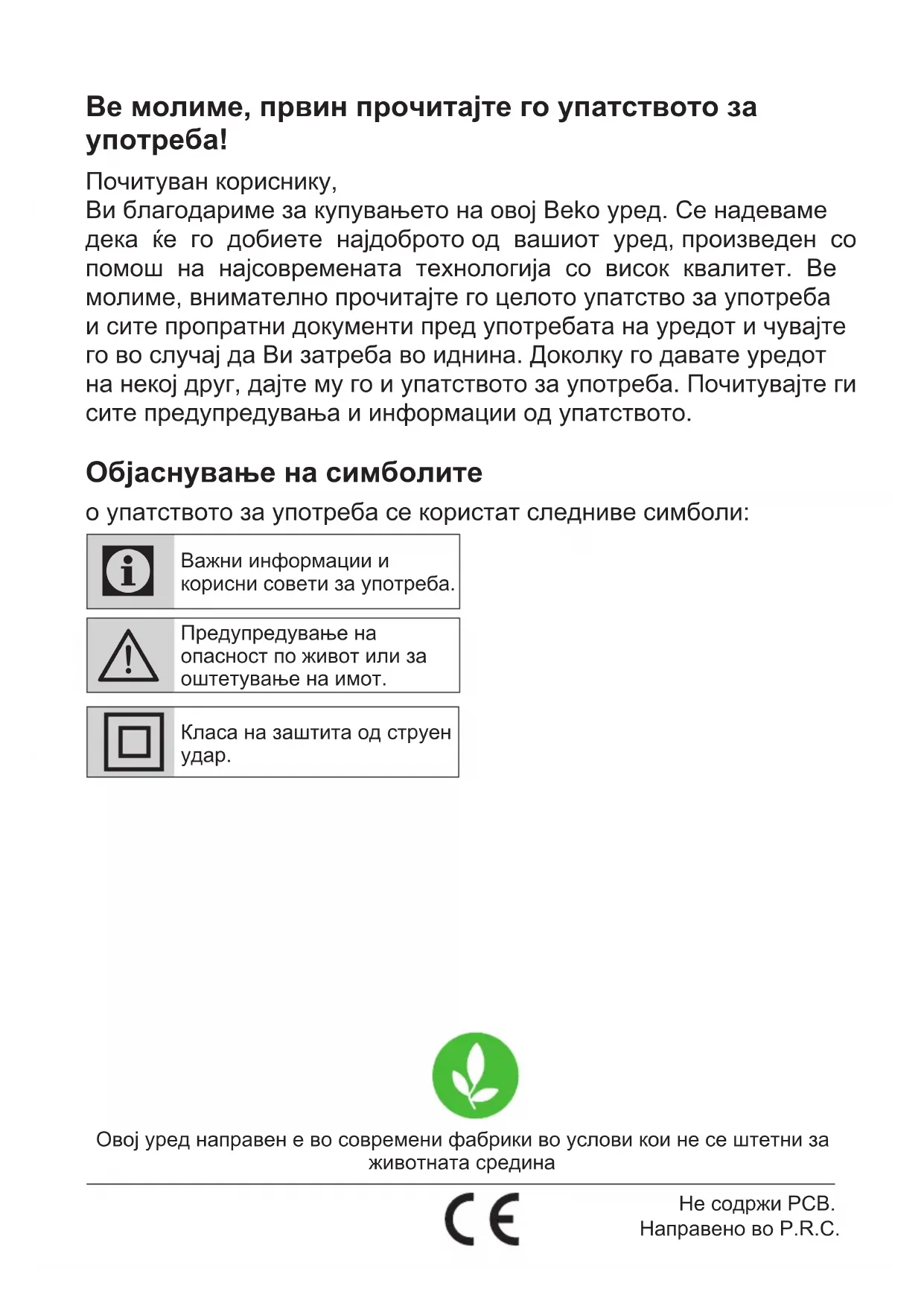 Почитуван кориснику, Ви благодариме за купувањето на овој Beko уред. Се надеваме дека ќе го добиете најдоброто од вашиот уред, произведен со помош на најсовремената технологија со висок квалитет. Ве молиме, внимателно прочитајте го целото упатство за употреба и сите пропратни документи пред употребата на уредот и чувајте го во случај да Ви затреба во иднина. Доколку го давате уредот на некој друг, дајте му го и упатството за употреба. Почитувајте ги сите предупредувања и информации од упатството. Oбјаснување на симболите о упатството за употреба се користат следниве симболи: