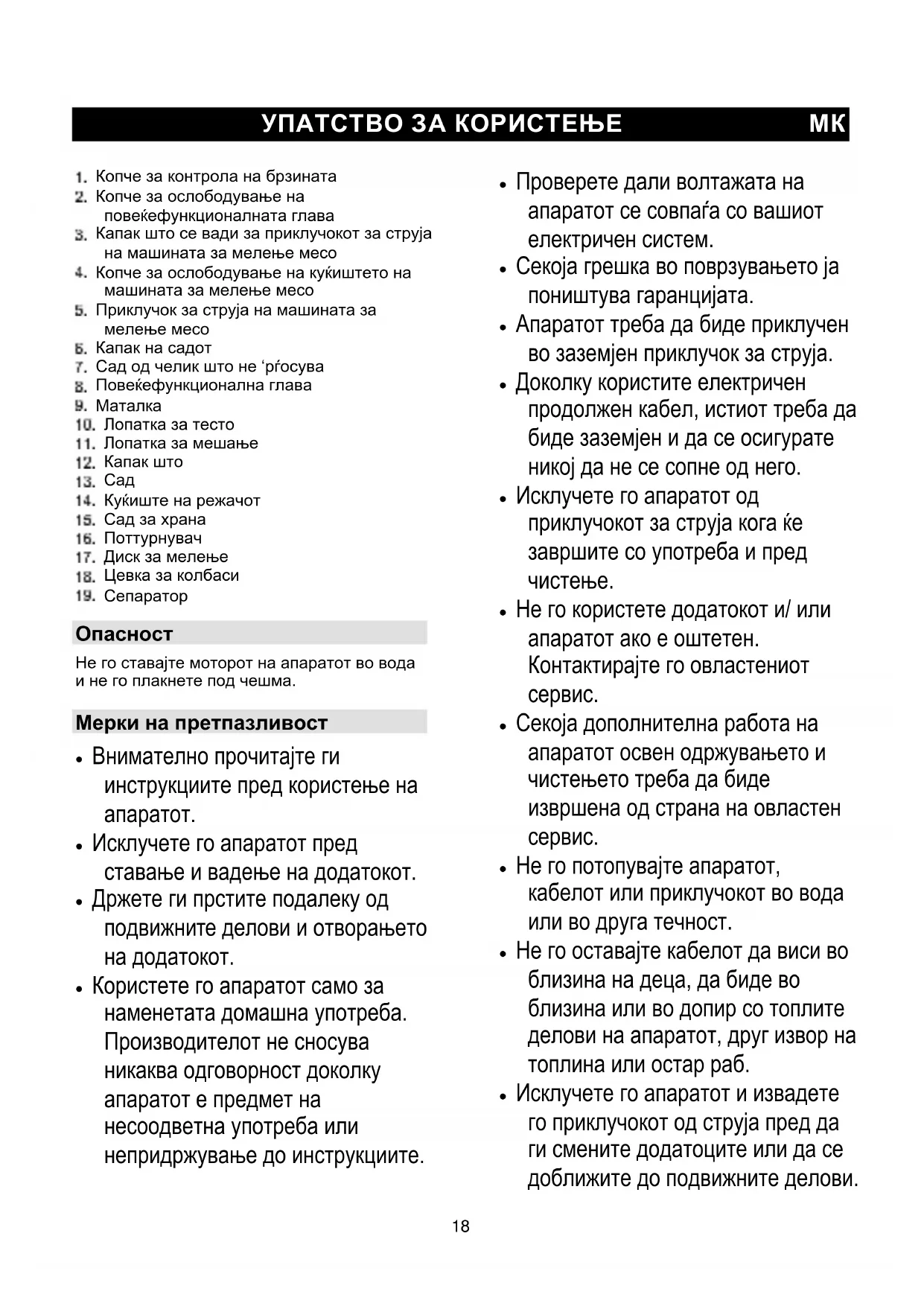 УПАТСТВО ЗА КОРИСТЕЊЕ МК Копче за контрола на брзината Копче за ослободување на повеќефункционалната глава Капак што се вади за приклучокот за струја на машината за мелење месо Копче за ослободување на куќиштето на машината за мелење месо Приклучок за струја на машината за мелење месо Капак на садот Сад од челик што не ‘рѓосува Повеќефункционална глава