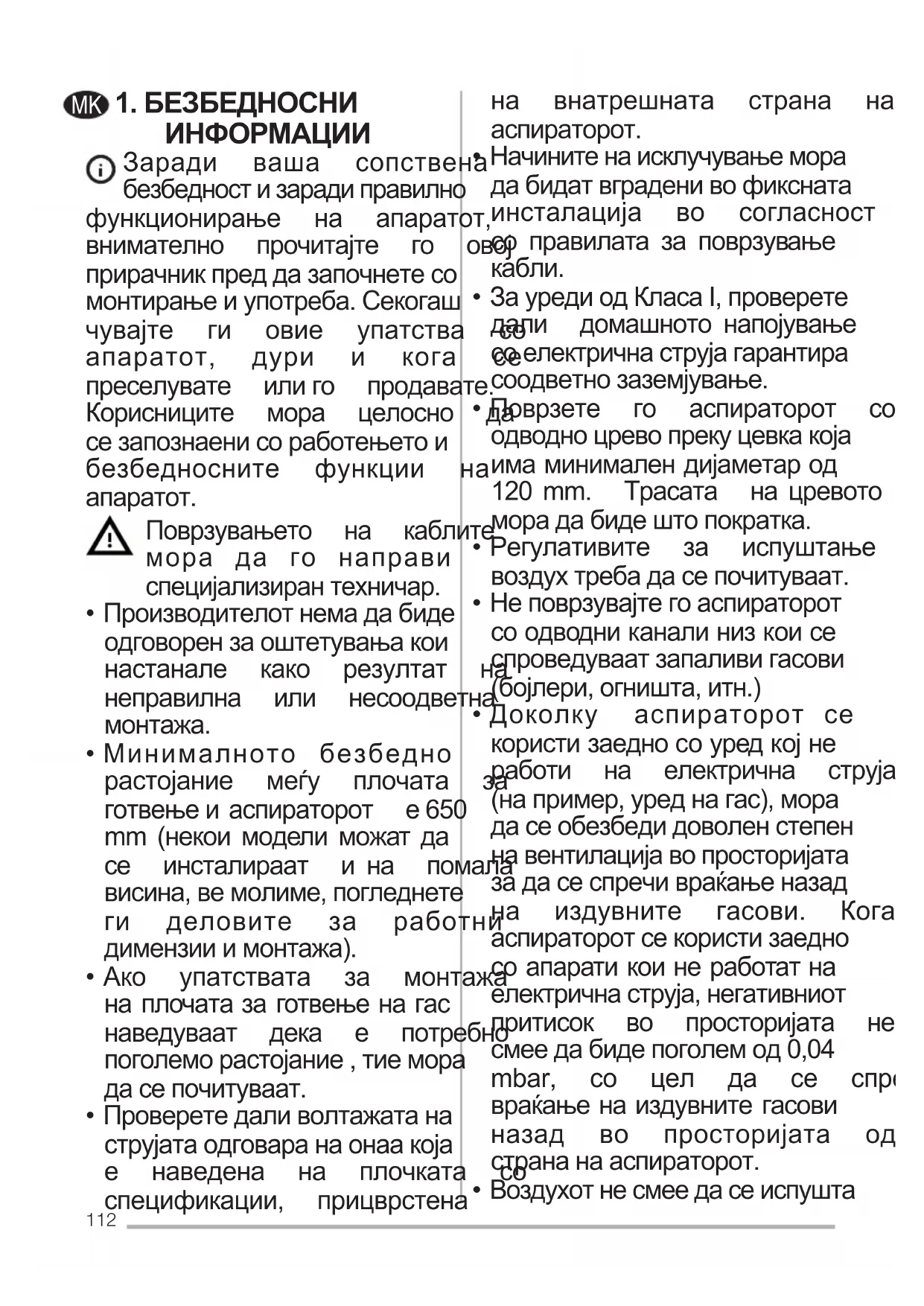 - Мора да има соодветна вентилација во просторијата каде што се користи аспираторот, а во која114 истовремено се користат апарати што работат на гас или на други горива (не е применливо за апарати што воздухот го испуштаат во просторијата).