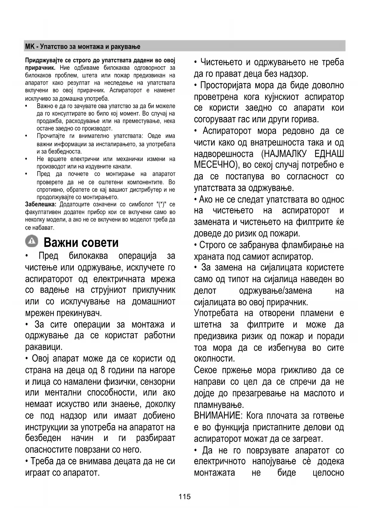 - Ако не се следат упатствата во однос на чистењето на аспираторот и замената и чистењето на филтрите ќе доведе до ризик од пожари.
