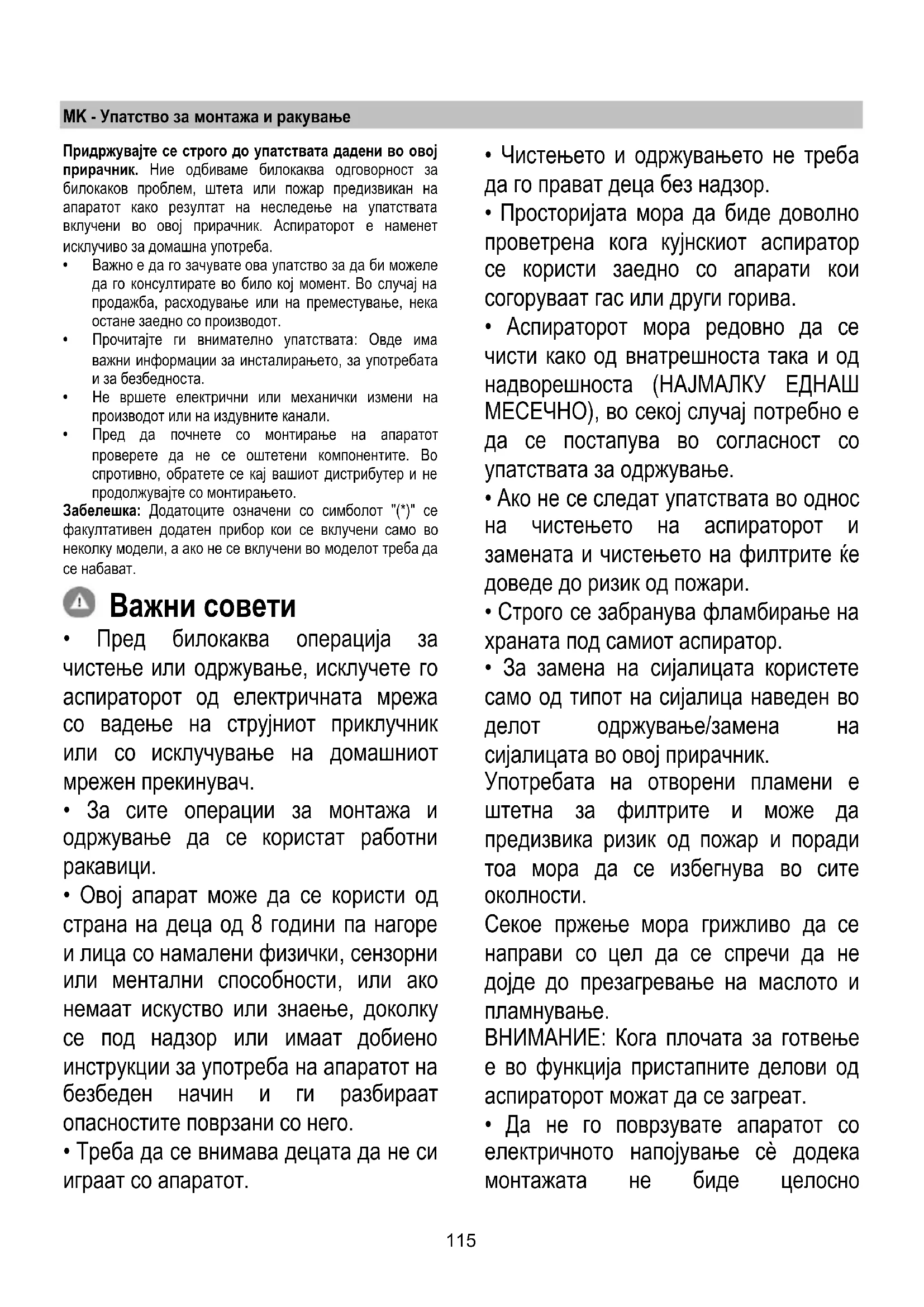 - Ако не се следат упатствата во однос на чистењето на аспираторот и замената и чистењето на филтрите ќе доведе до ризик од пожари.